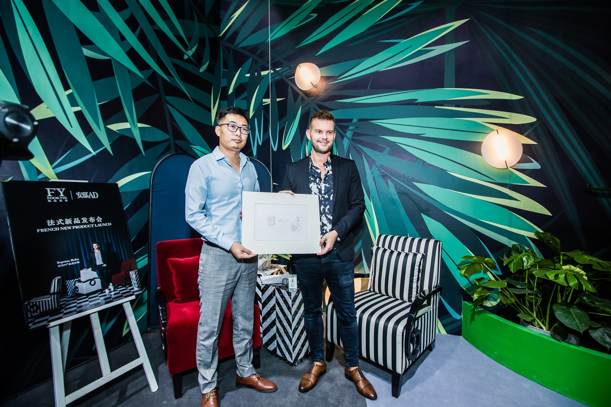 此次发布会还准备了一个特别的手稿交予环节:设计师Baptiste Bohu将极具收藏价值,见证双方第一次愉快合作的珍贵手稿转交给福溢家居的赵忠杰先生。