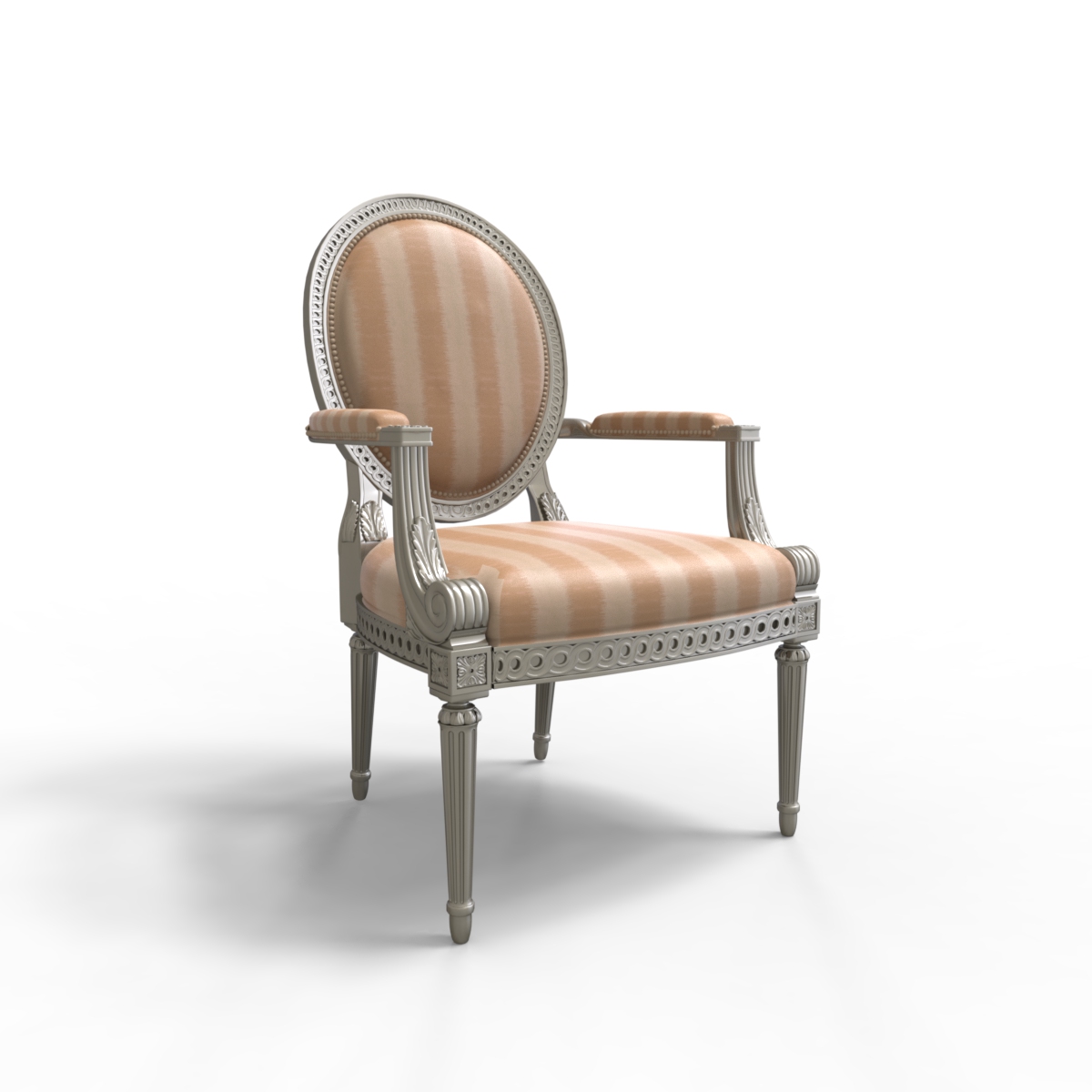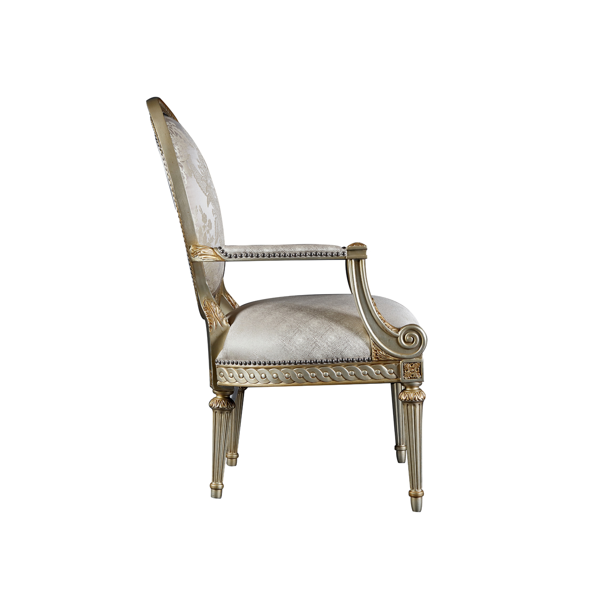 这款休闲椅是参考18世纪法国路易十六时期涂金扶手椅古董设计,并结合同时期的圆面背板设计。配上精致的连续雕刻、锥形脚设计、触感舒适的布艺和包有丰厚的填充物坐垫和靠背。