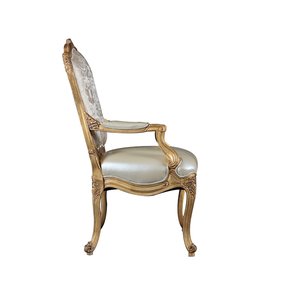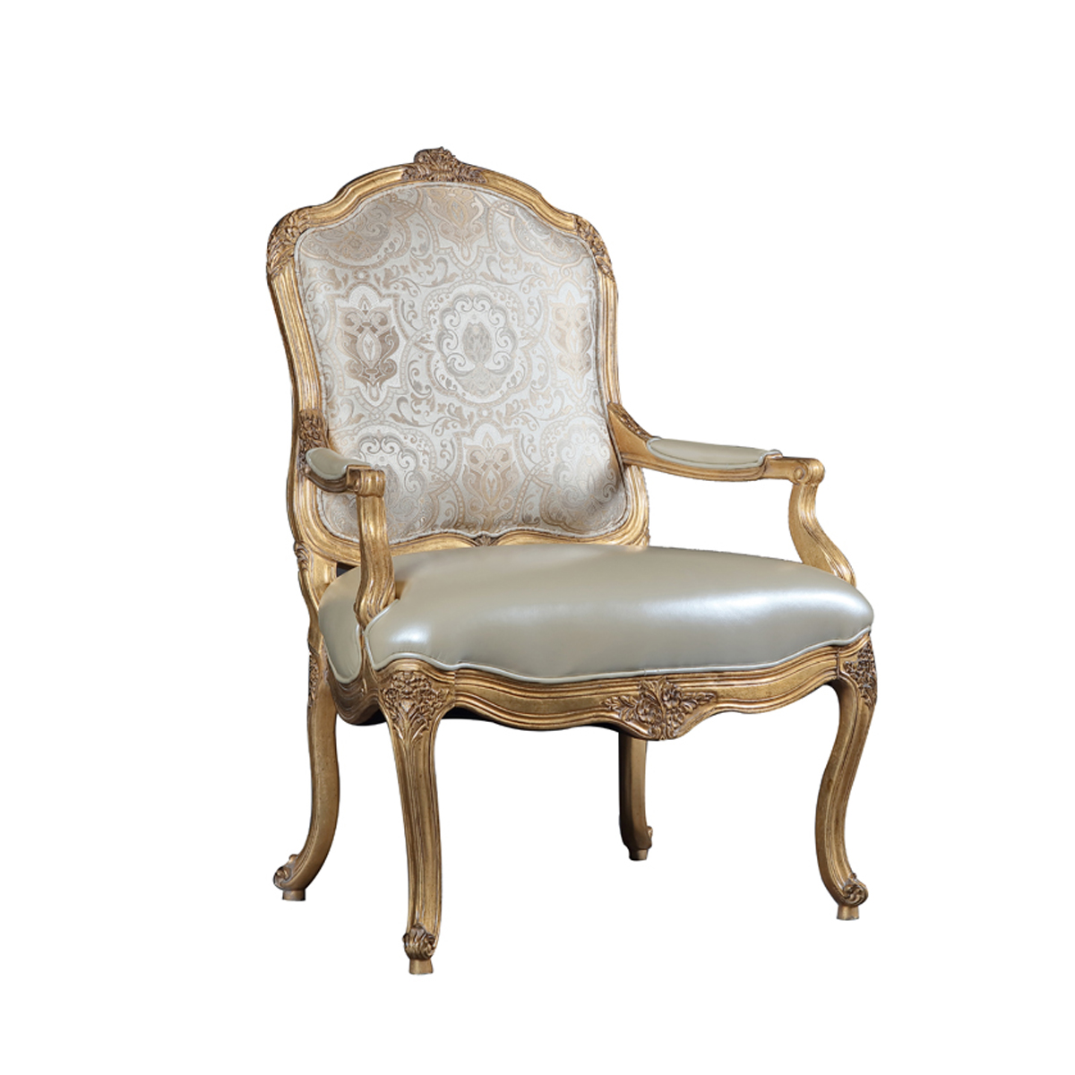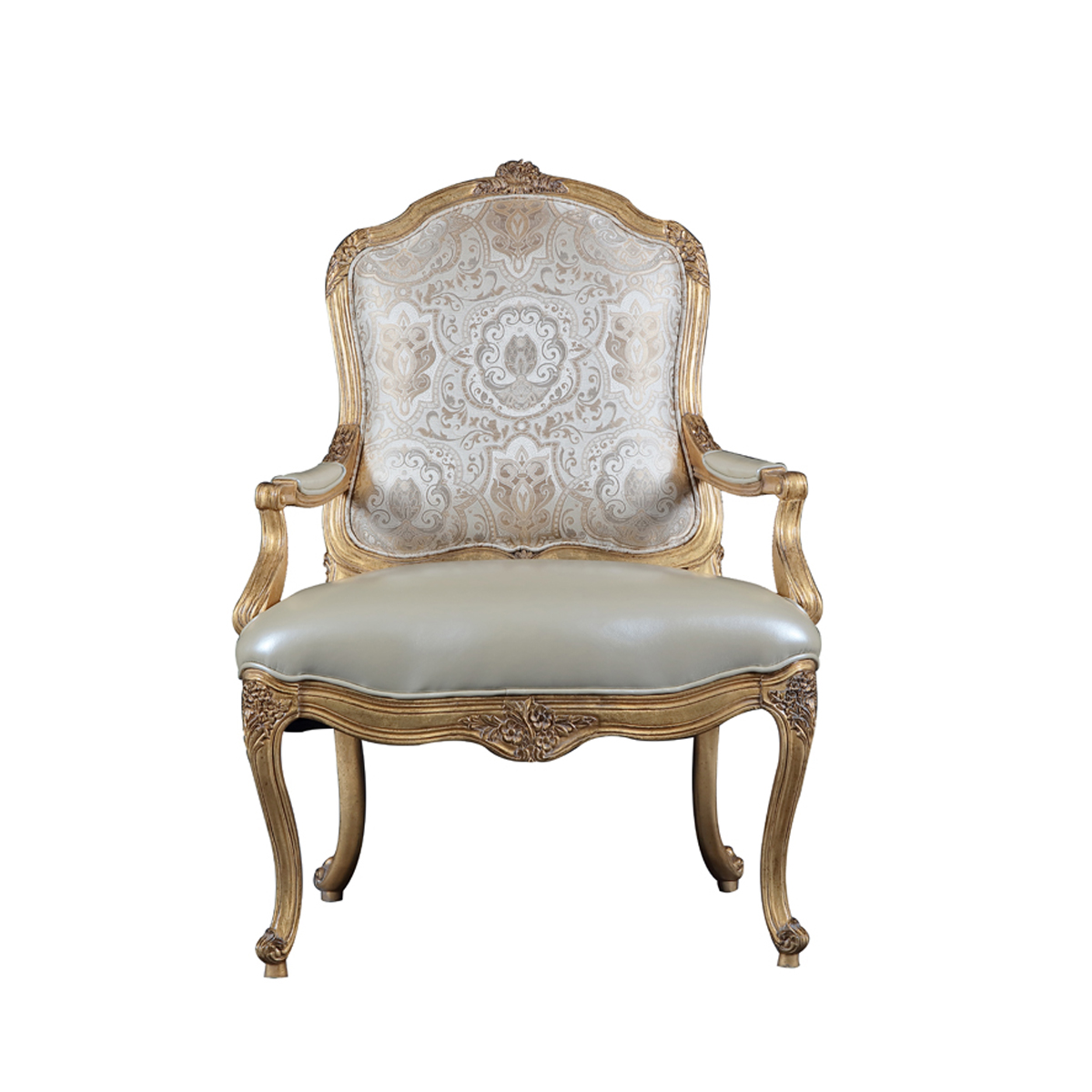 参考18世纪法国路易十五时期经典的法式 Bergère 椅设计 ﹣多以婀娜的 Camelback Silhouette(驼峰轮廓)和外露的木框架表达;并配上细致的卷叶雕刻工艺、触感舒适的布艺、法式经典弯脚和金箔描金工艺,释放法式浪漫情怀。