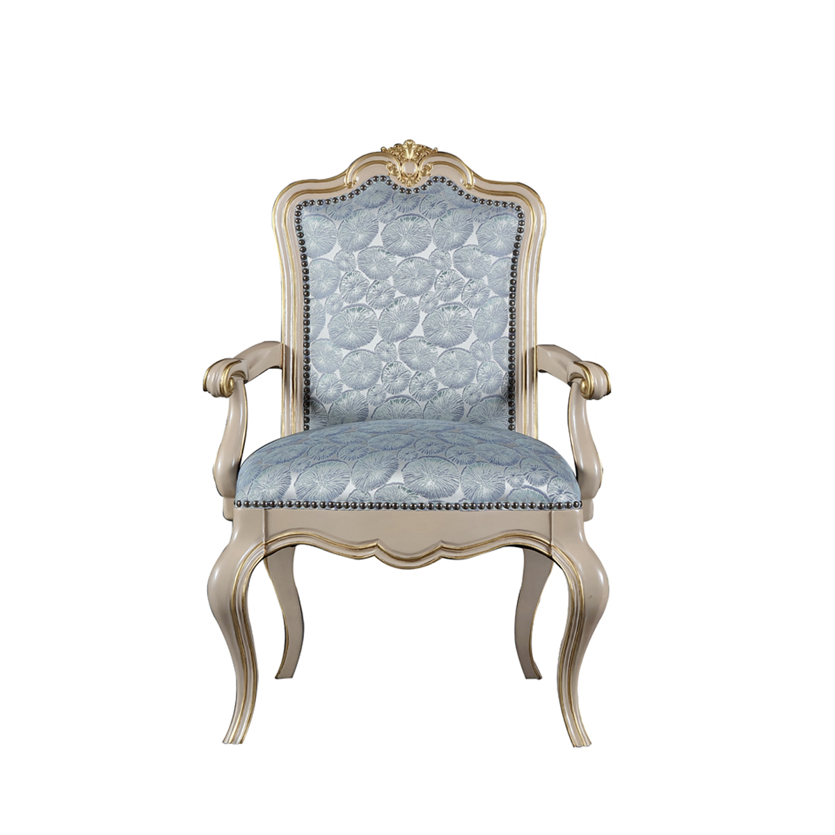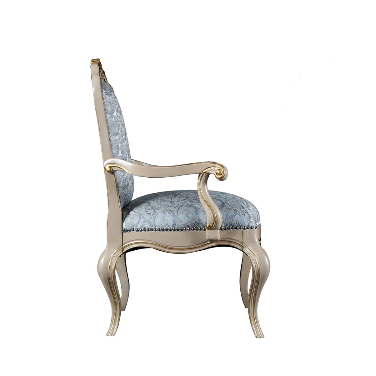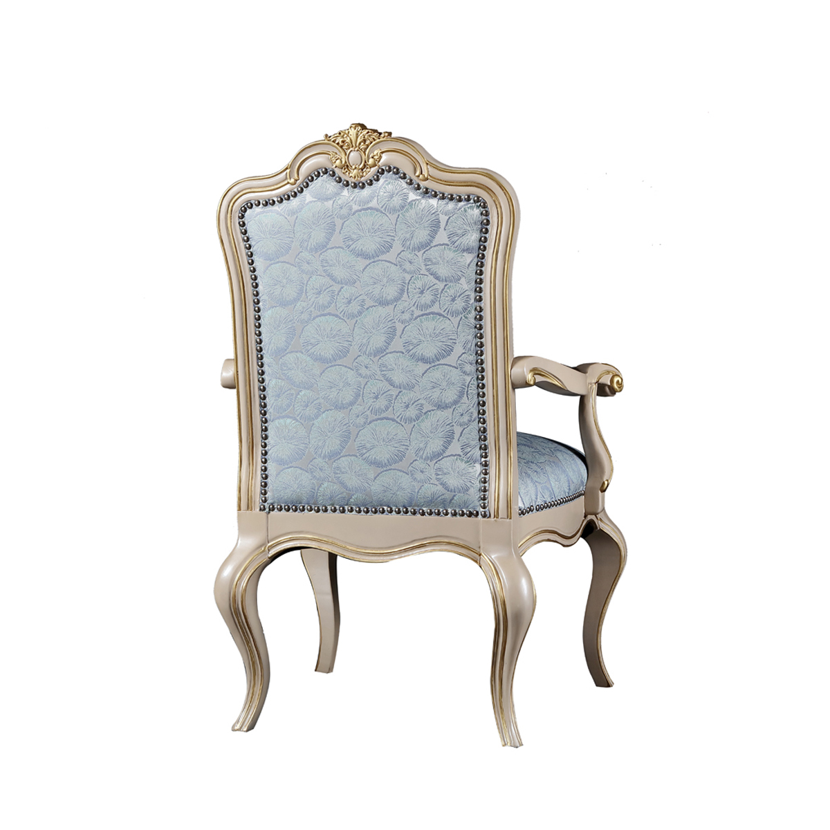优雅的琴背造型,茛苕纹描金雕刻,经典的法式“S”型弯腿,如天鹅颀长的脖颈一样优美曼丽,时尚铆钉装饰为休闲椅气质加持,将轻奢注入人文细节。