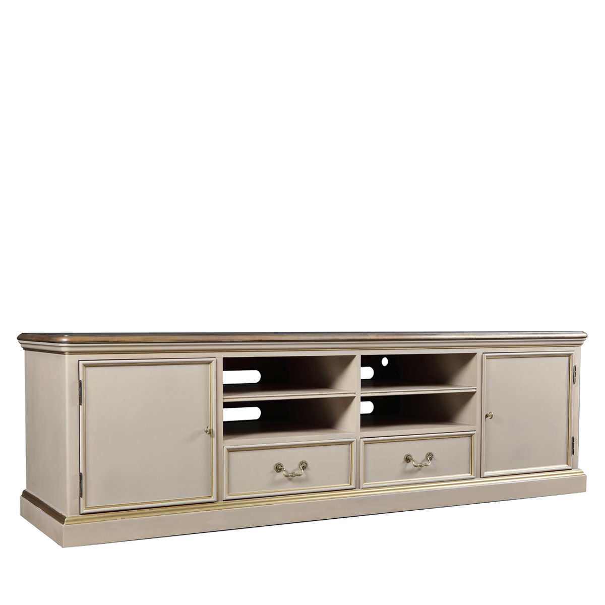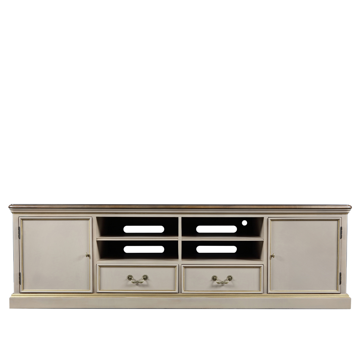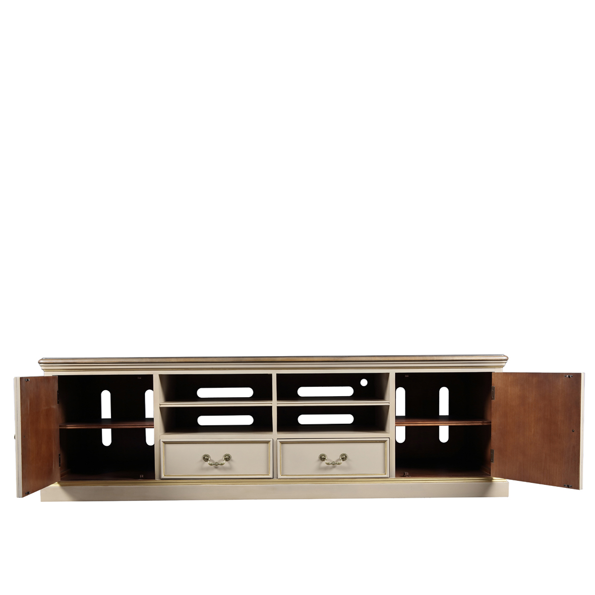 * 中间两个储物抽斗,左边抽斗配有CD/DVD隔板,可CD/DVD更好的存放,其底部采用经典硬木实木滑轨设计; * 两扇门内各有1块可调层板; * 中间上部为开空设计,内部各有一块层板,可在内放播放器等电子器材; * 脚底部装有可调脚钉;