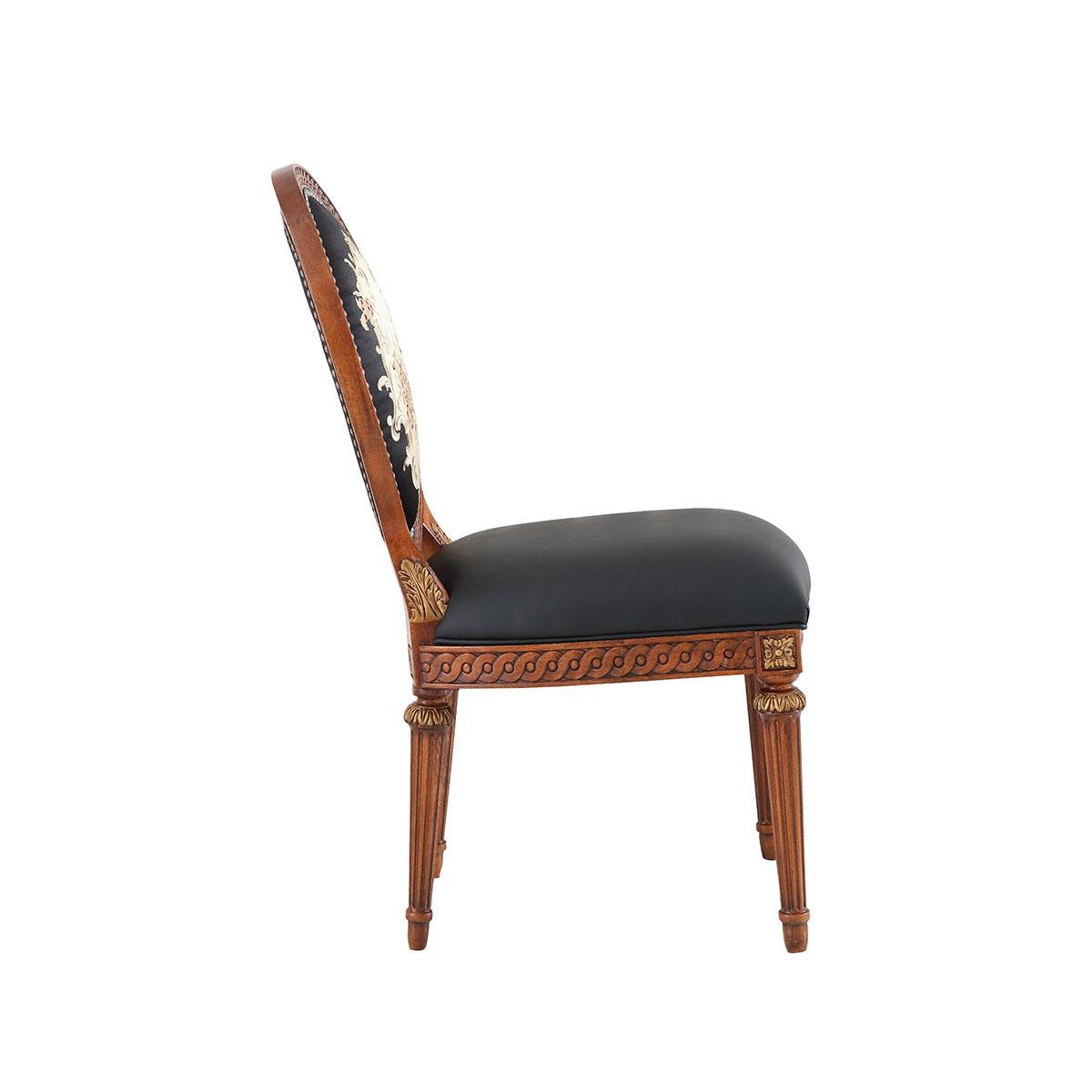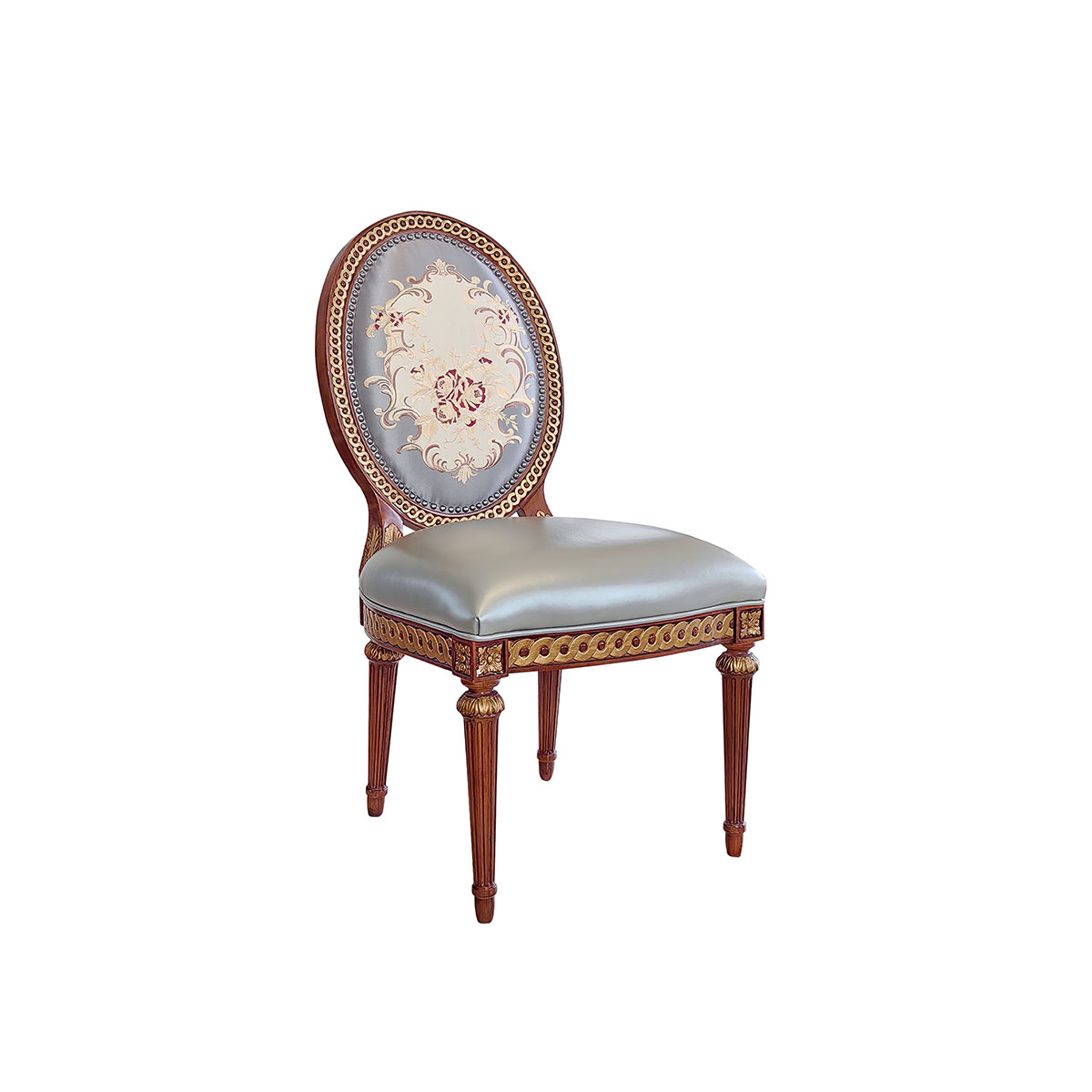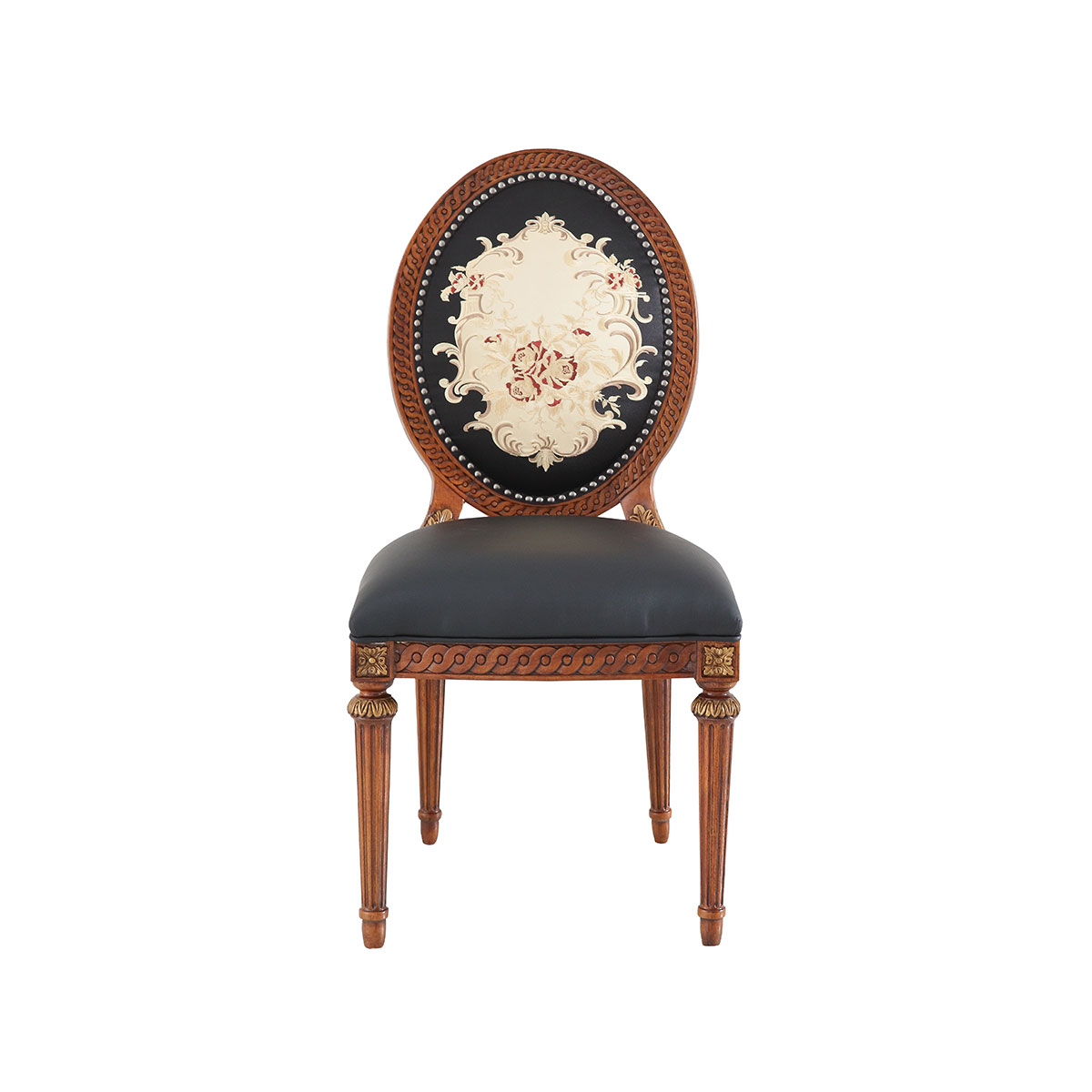 参考18世纪法国路易十六时期涂金扶手椅古董设计,并结合同时期的圆面背板设计。配上精致的连续雕刻和贴金铂工艺、锥形脚设计、触感舒适的布艺和包有丰厚的填充物坐垫和靠背。
