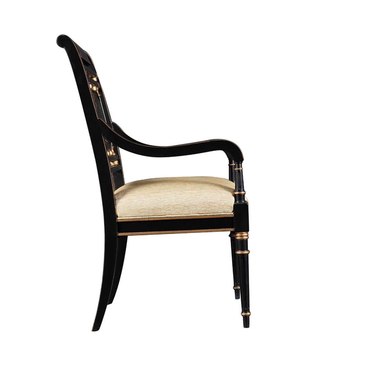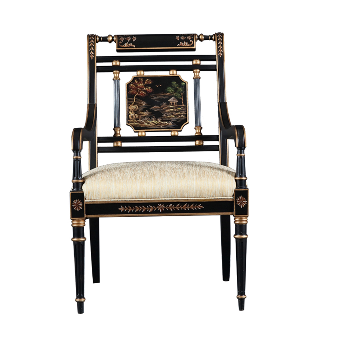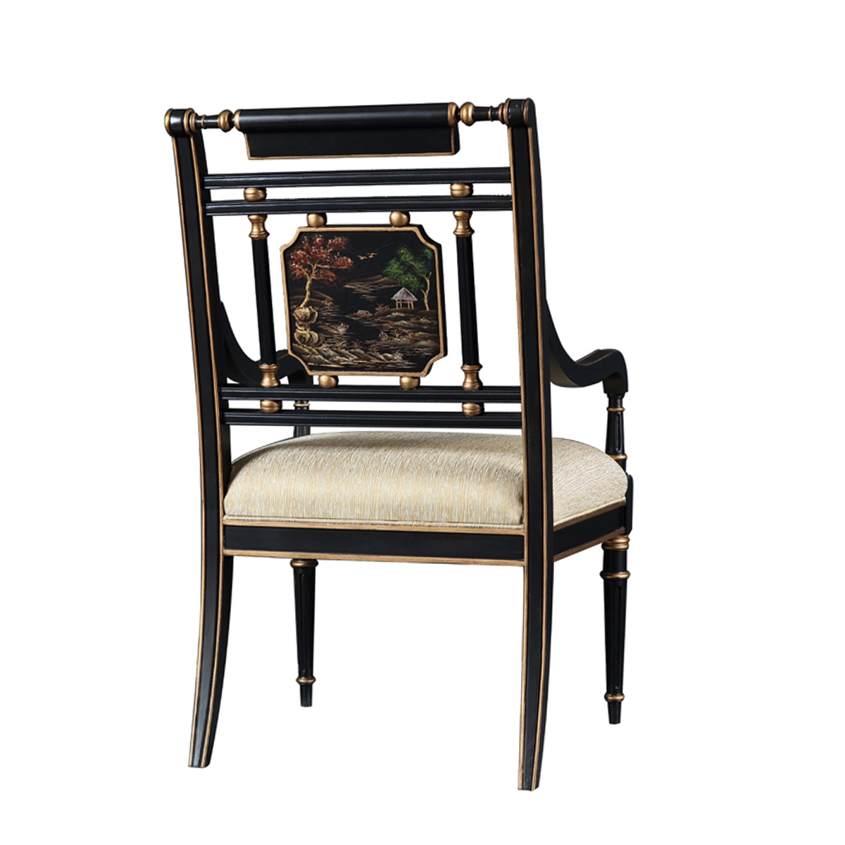 黑铮发亮的悟空体育官网上描以金黄色的山水图画,婉然挂着一幅名家的山水画。配合极具英式文化精髓的谢拉顿椅脚及镂空造型,让整个空间协调,充分展示了中西家居文化相互糅合的设计创意。