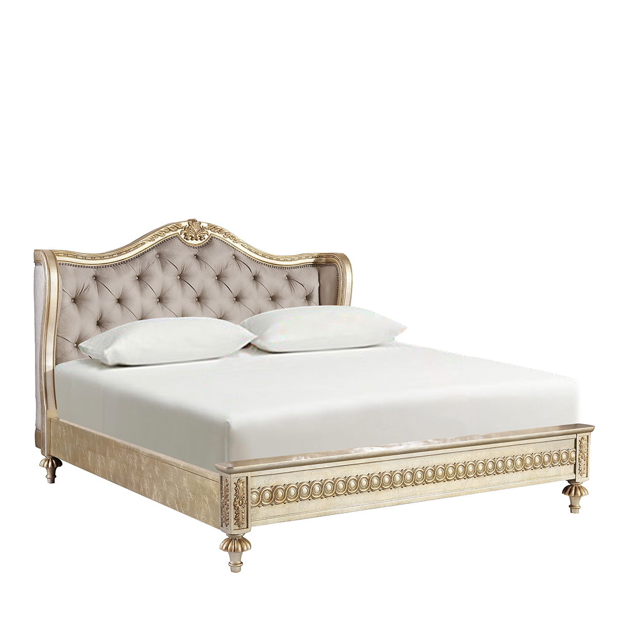 设计灵感源自法国浪漫奢华的凡尔赛宫,采用路易十四时期的太阳花连环雕刻和宛如翅膀扩展形状的床头板设计,配以实木花环和卷叶雕刻,表现凡尔赛宫的庄严;米黄色温和的色调选择,在庄严中带来丝丝浪漫之意。