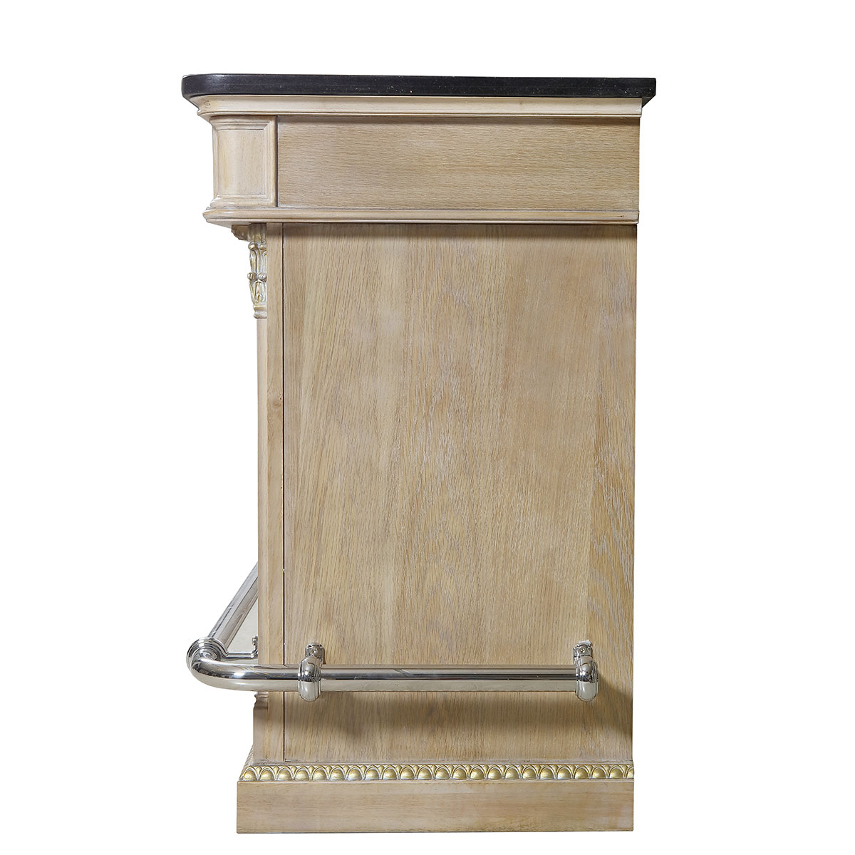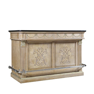 * 手工雕刻的工艺细节和精致优美的手工拼花结实的连接技术18道以上的多步骤油漆工艺 * 面板板大理石设计。 * 正面一排闪闪发亮的小型调节灯和珍贵的金属。 * 面板两侧配有两个高品质音响喇叭,右边搭载蓝牙播放器和冰桶、冰杯。左上方一块切手果实木板和1个放置水果餐具的小型储物抽斗,下左方为开空设计,方便存取物品,一块实木层板,底端用来放置高品质音响。 * 中间上方一排酒杯架,一块实木层板,下面三排酒槽。门内有一块实木层板。 * 底部装有可调脚钉。