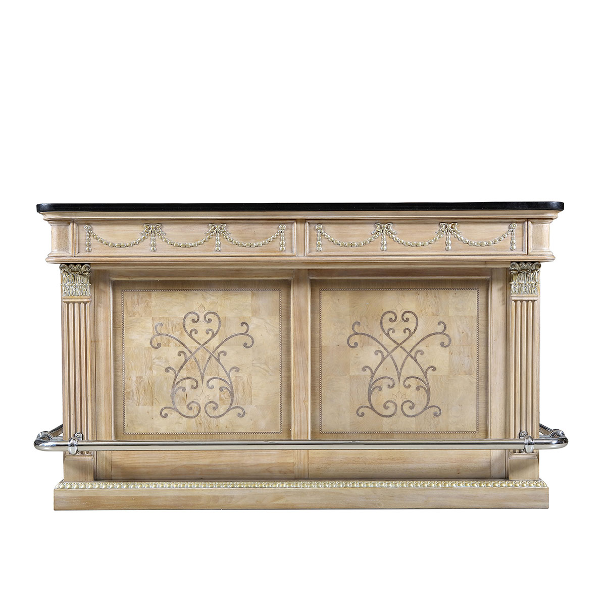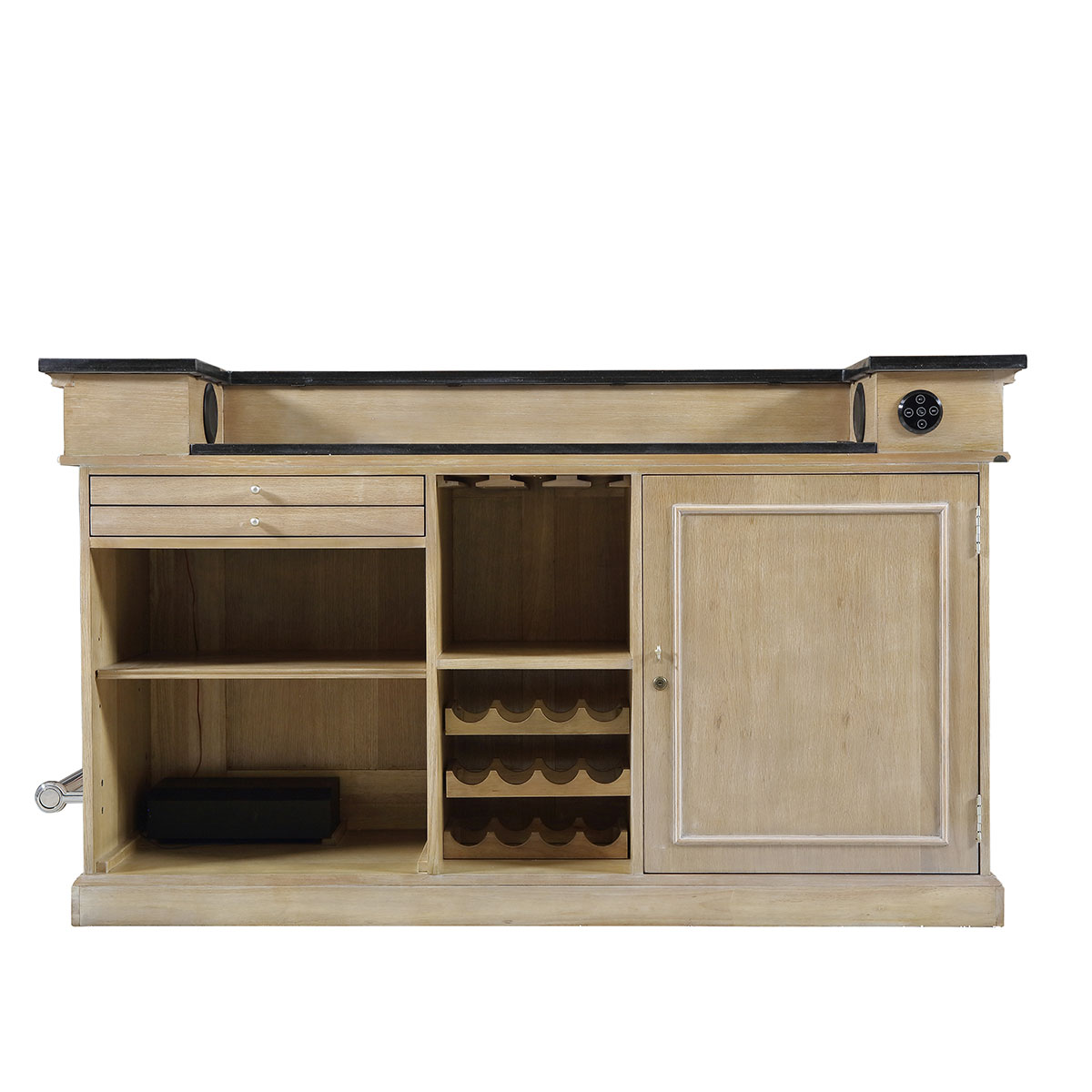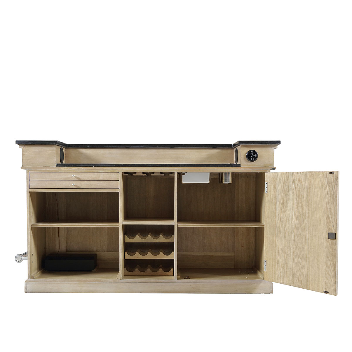 以拼花描金装饰外观,台面采用精致实用的大理石,脚踏为珍贵的金属材质,樱桃木实木砧板与防生锈刀叉存格可用来料理享用美食,冰桶配冰杯是调制饮料的好帮手。搭载蓝牙播放器、高品质音响及触摸LED灯开关,完美演绎意大利人重生活更懂艺术的品位追求。