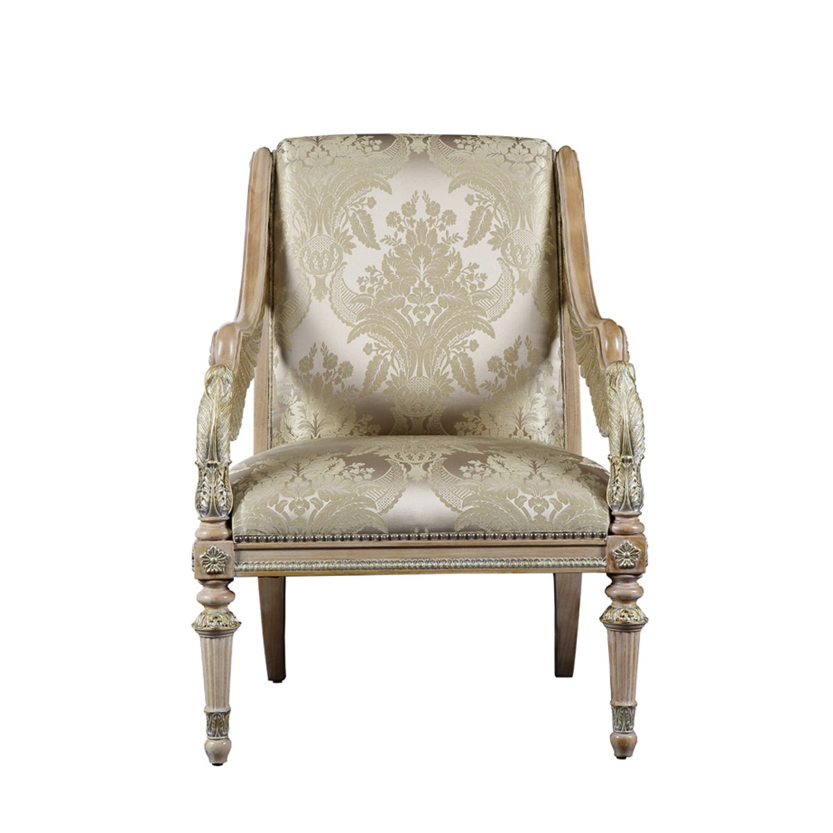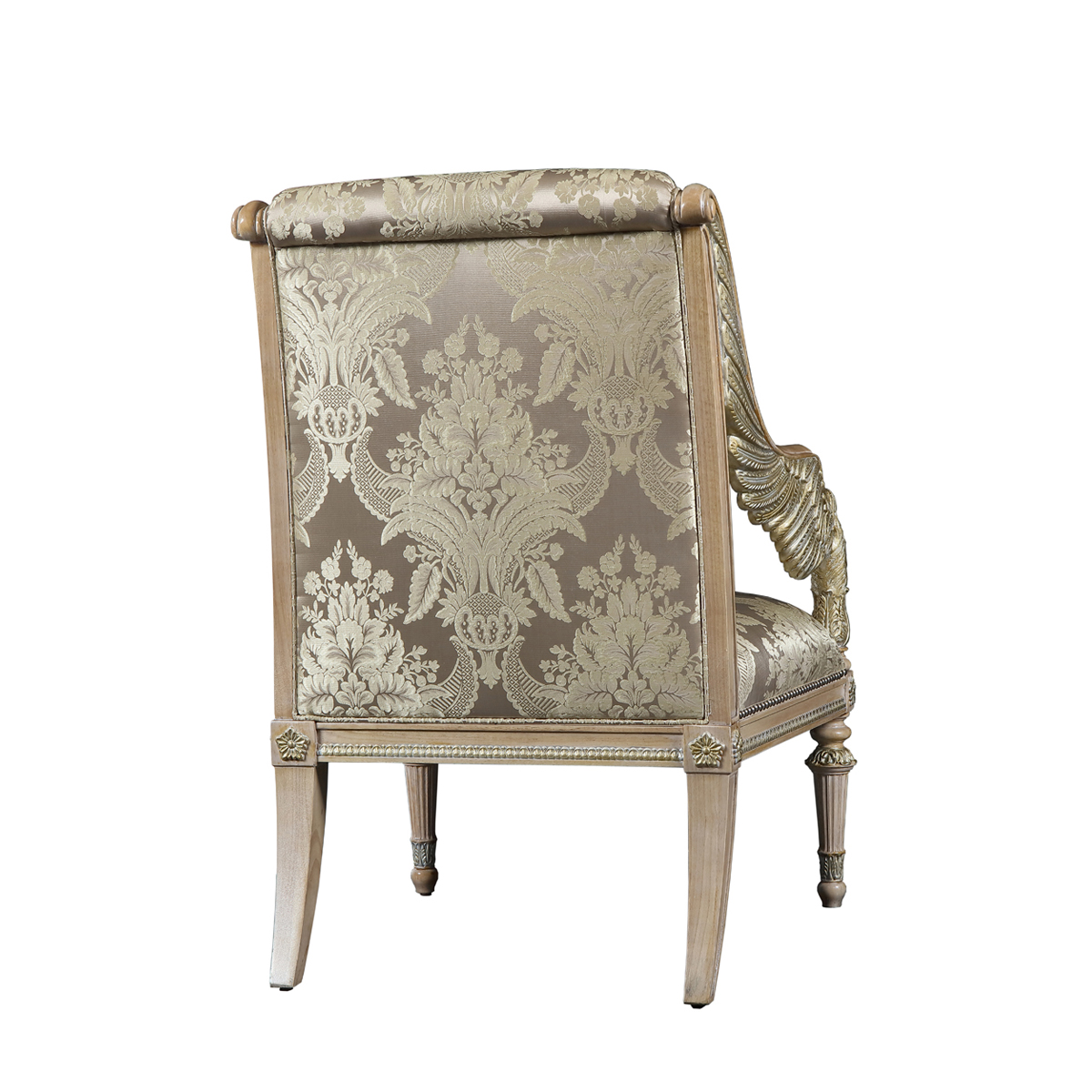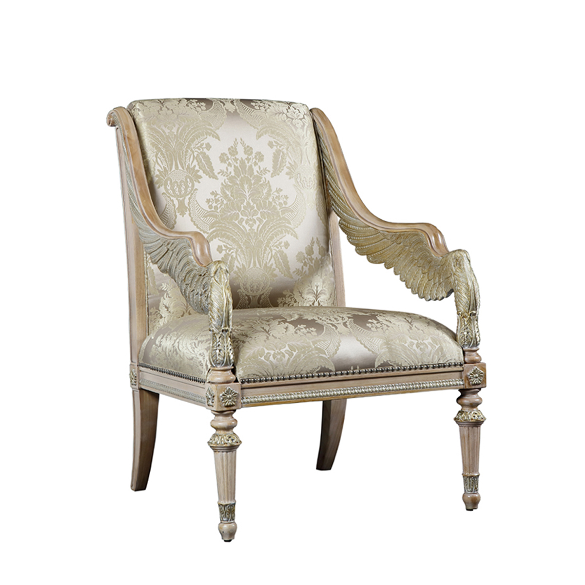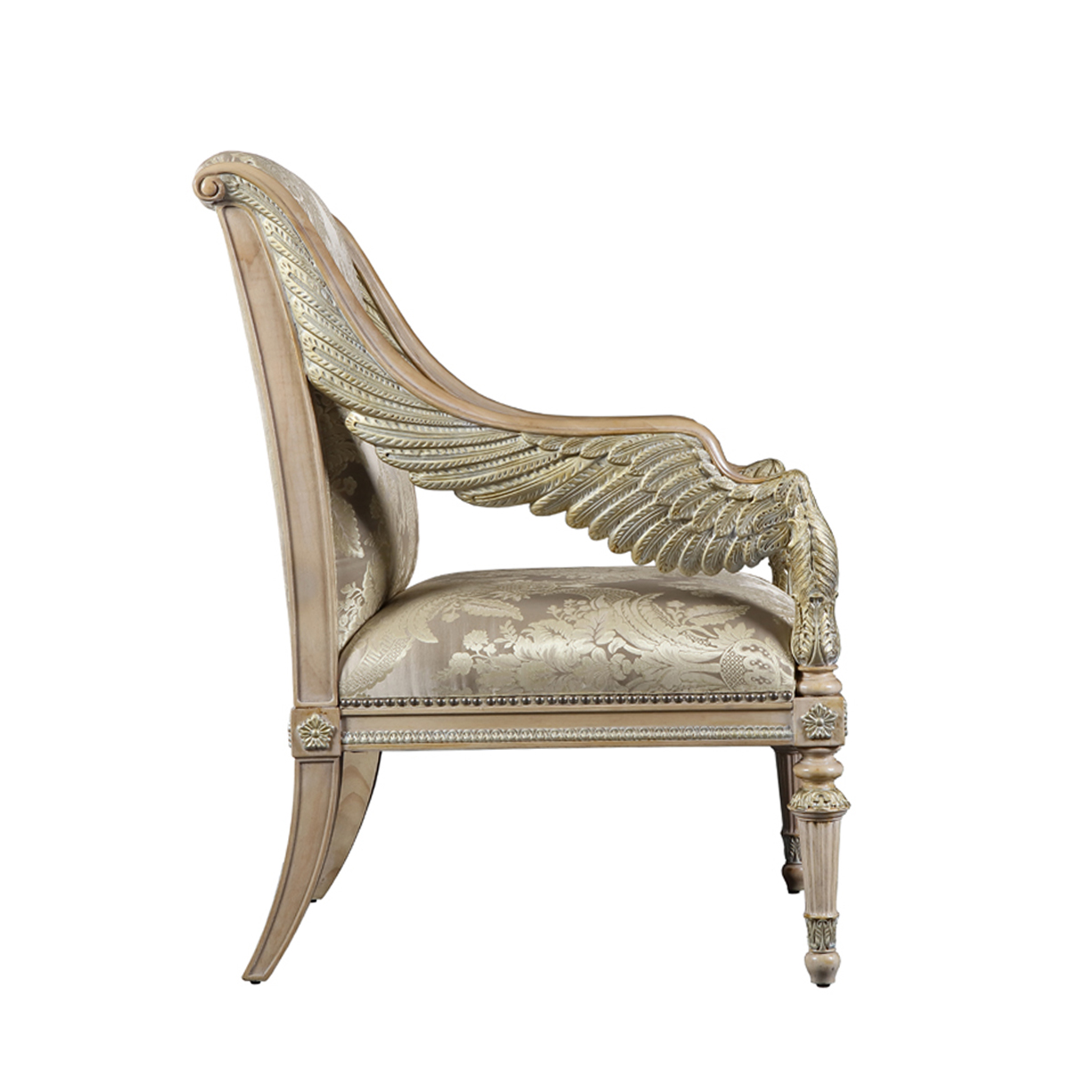 以现保存在法国"卢浮宫"的 “胜利女神像”为意念,并结合意大利强调帝权象征的帝国EMPIRE风格元素中翅膀造型,设计雕刻出胜利女神-Samothrace翅膀扶手,羽翼丰满的羽毛雕刻极为精巧经典,栩栩如生,复兴你的典雅情怀。