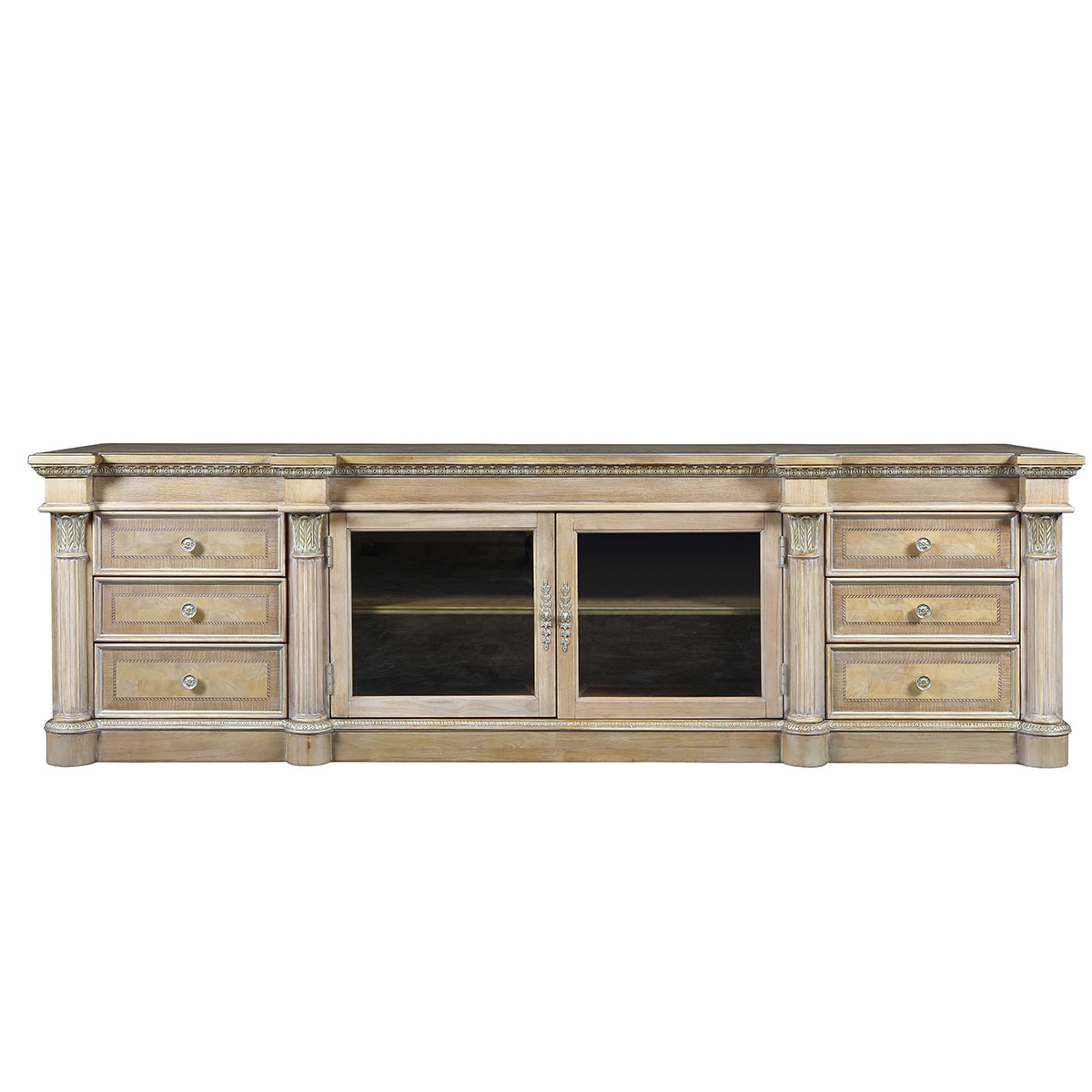 翡冷翠电视柜白栓树瘤、橡木皮、枫木等多种木皮进行手工拼花彰显了古老手工技艺的迷人魅力,罗马圆柱饰以细腻的阿坎赛斯叶状雕刻与描金工艺,搭配功能性储存空间,将艺术审美与实用功能进行了完美的结合。
