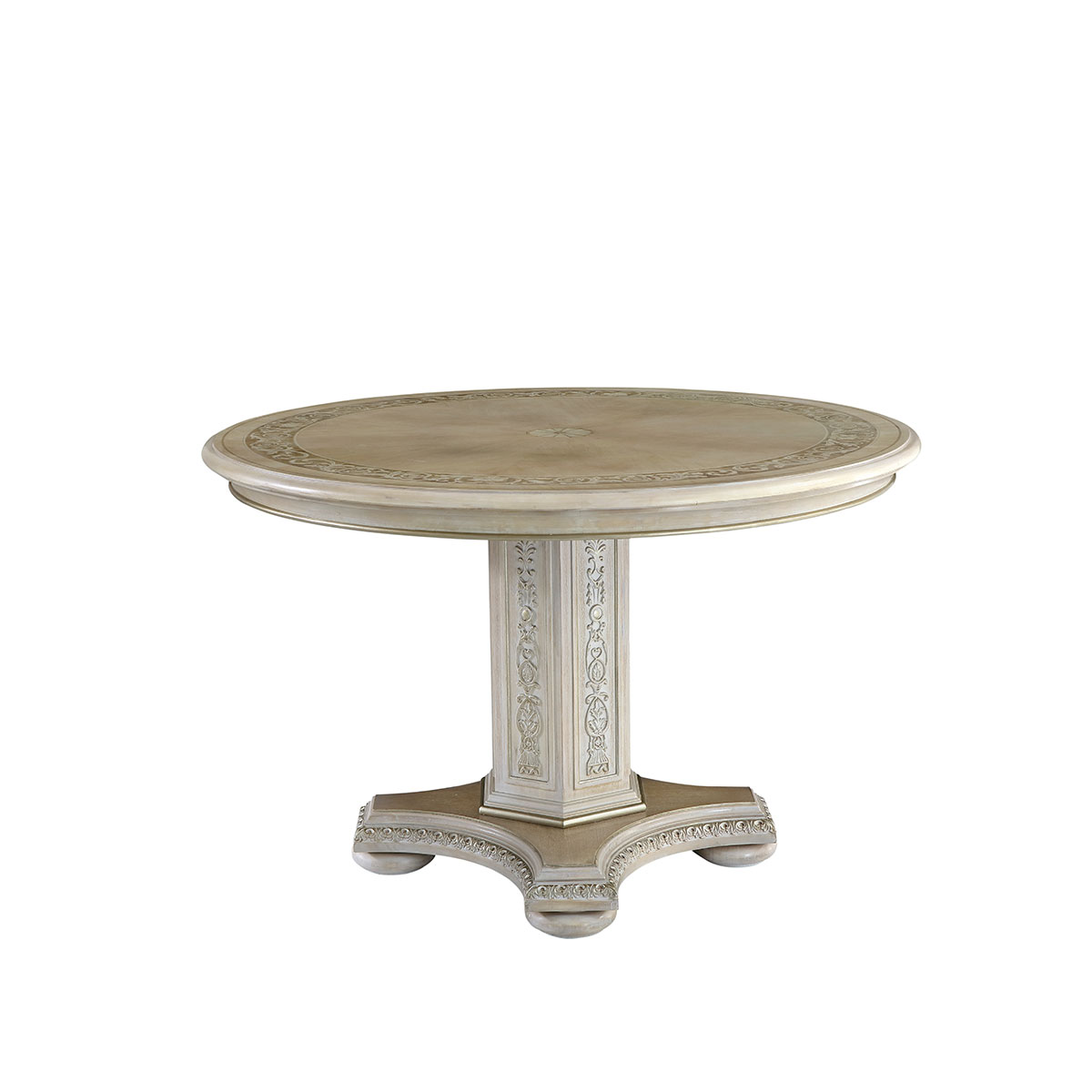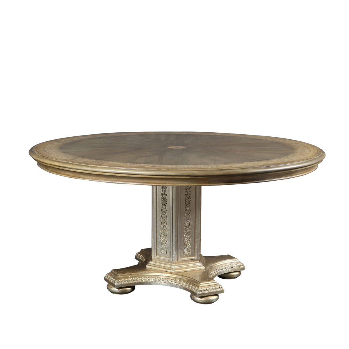 复古而有时尚感的涂装,井然有序的雕刻,栩栩如生的花纹装饰,纹理清晰呈花形放射状散开的木皮拼花,柱形桌腿稳重踏实,如同将伫立千年的欧洲经典建筑,将匠心凝结在了每一个雕花,每个细节之间。