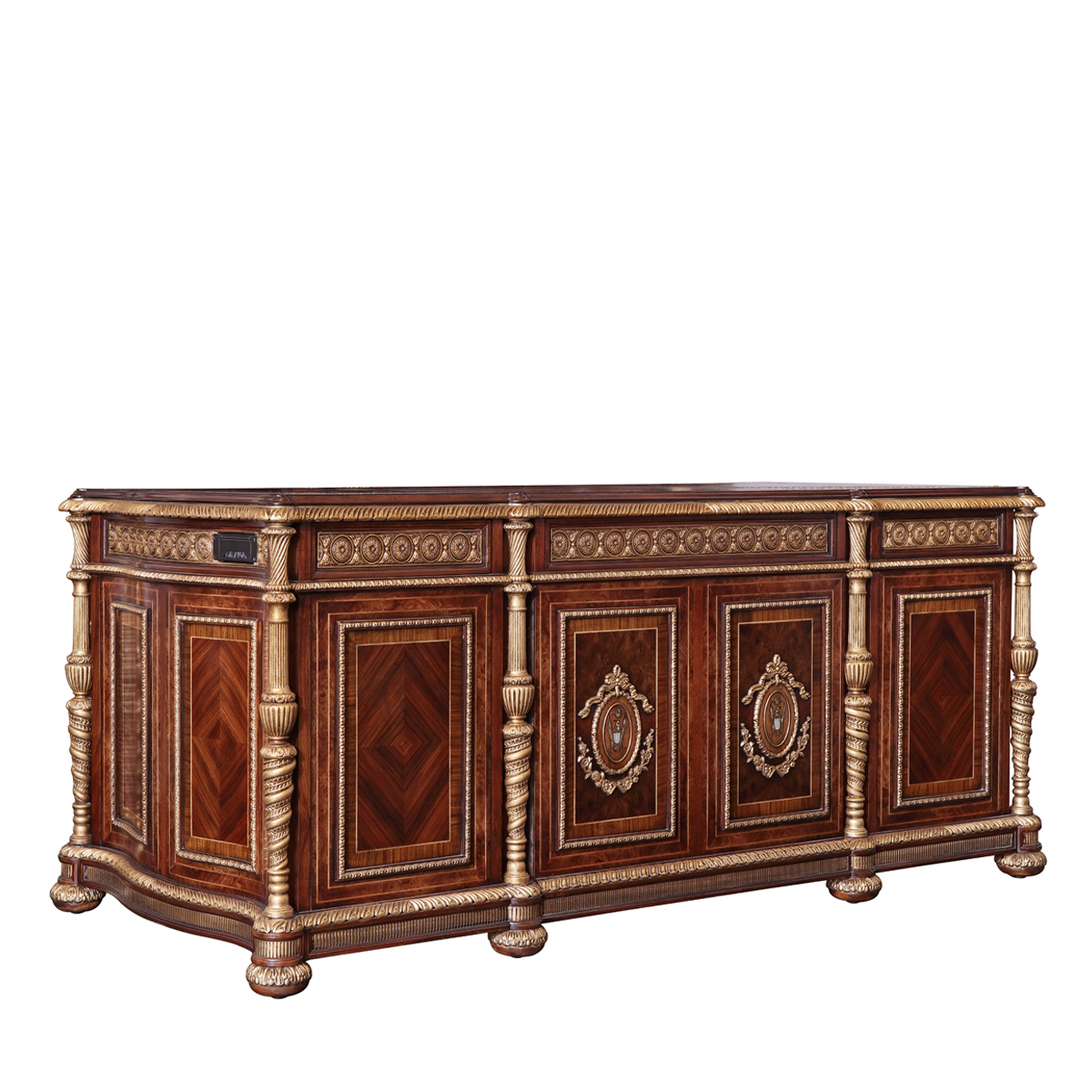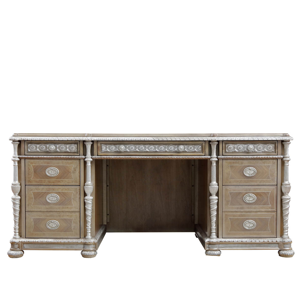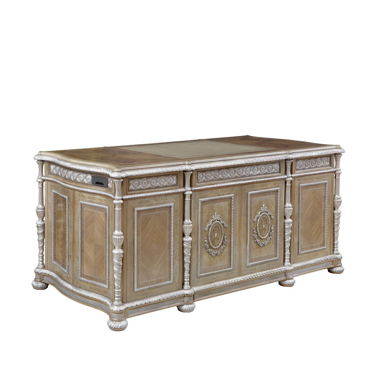 * 写字台上中部分为左右上斗,抽斗两边装有2条三节消声铁滑轨,滑顺耐用,斗内装有文档挂条,中下斗配带锁储物抽斗或文件斗; * 左右下斗为两个斗看似为两个抽斗形状的大档斗或文件斗; * 办公桌前面中央为开空的存放空间,一块木制层板,放便存取书籍; * 写字台底部装有大号可调整脚钉