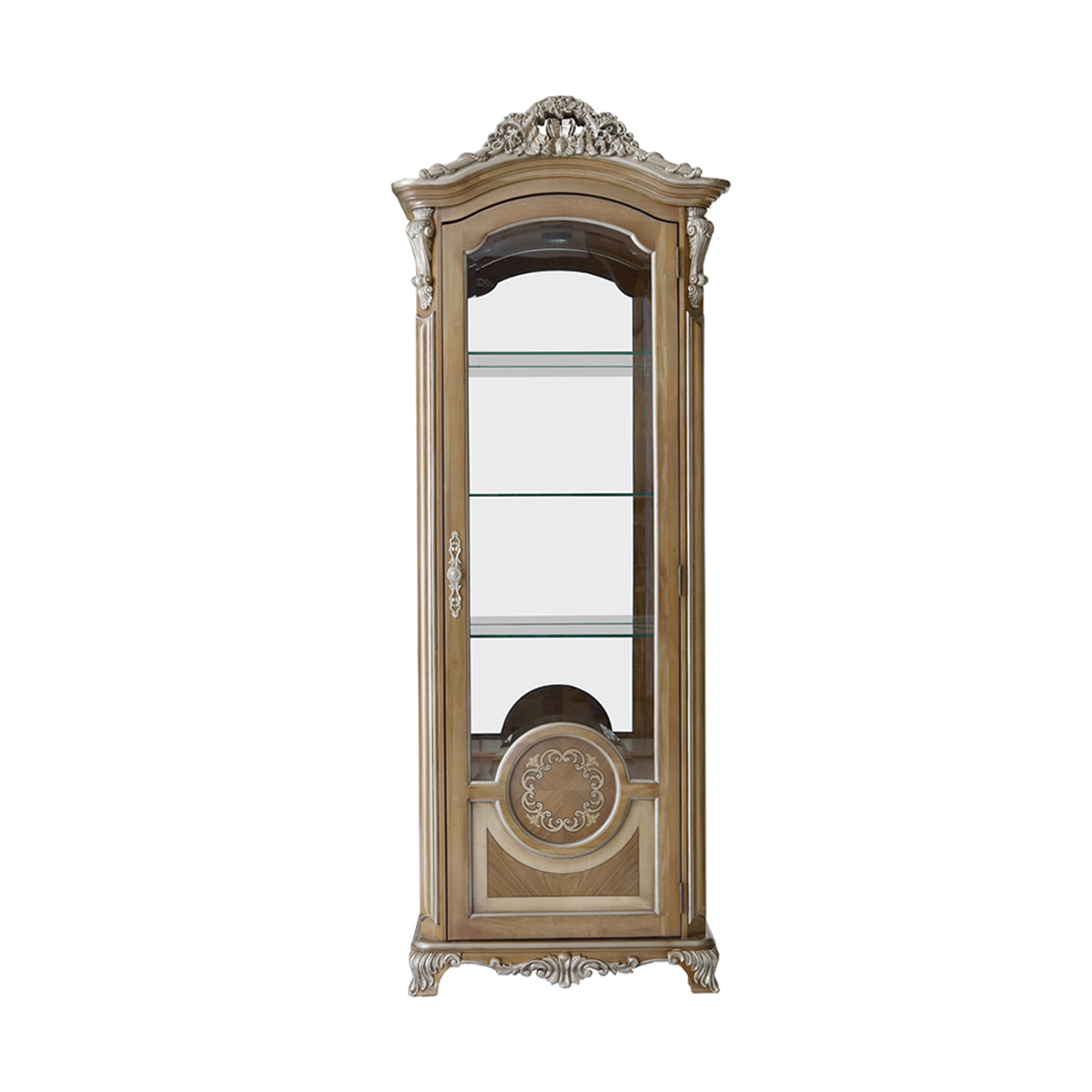 * 精致的手工雕刻细节 * 实木框玻璃门,门内有三块玻璃层板; * 底部装有可调层板;