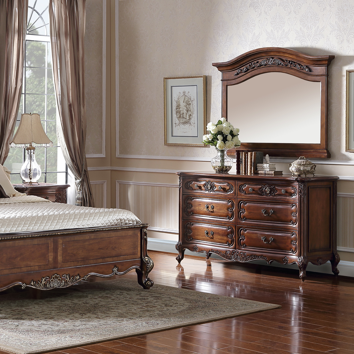 * 浪漫的香颂犹如历史悠久的杜乐丽花园般,每每散发著其独特的韵味。为表现杜乐丽花园的休闲惬意,使用花环和卷叶造型的实木手工雕刻,配以独特的拱顶设计,是经典系列香颂法式梳妆镜的特色。