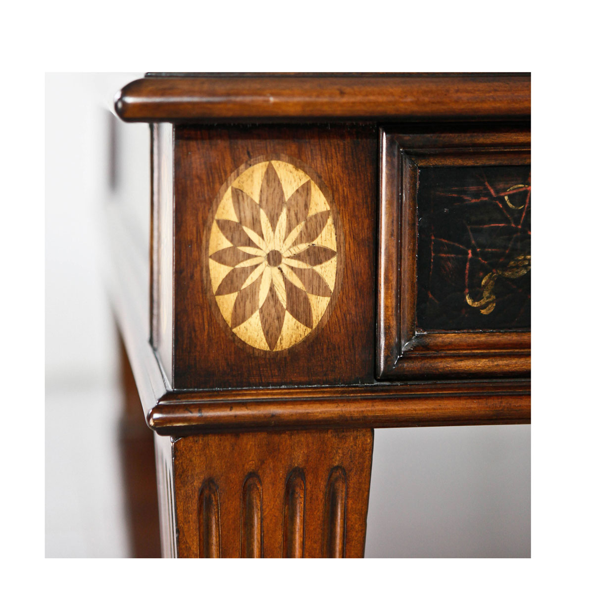 * 以18世纪英吉利——“日不落帝国”为设计主题,将东西方的多种艺术元素结合在一起。精致的木皮贴面,展现了高档木材的天然纹理,带出独特的立体感;黑底金漆的山水手绘,颇具东方情调。配上Sheraton(谢拉顿风格)的锥形凹槽柱和层板设计,是经典系列英吉利经典英式长方咖啡桌的特色。