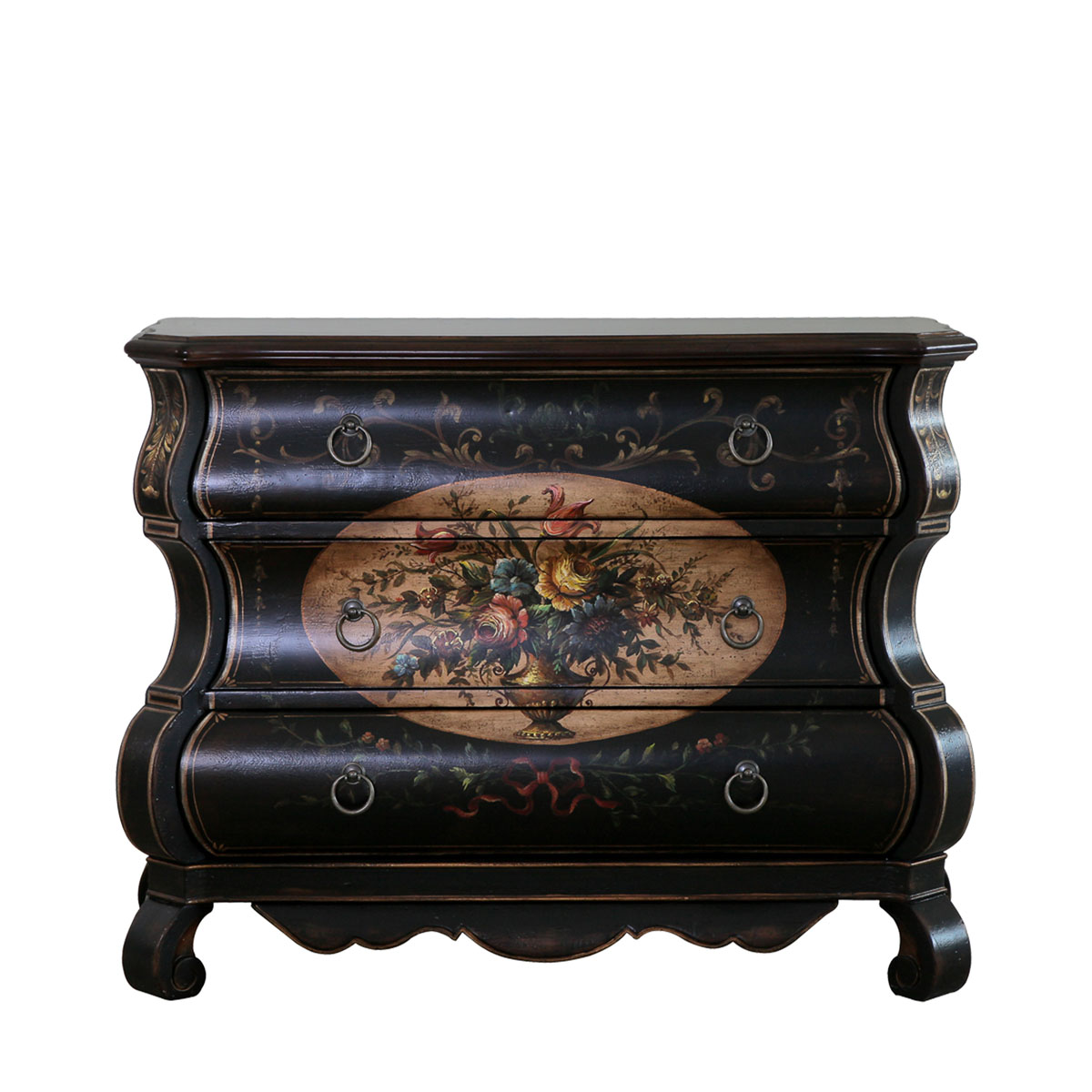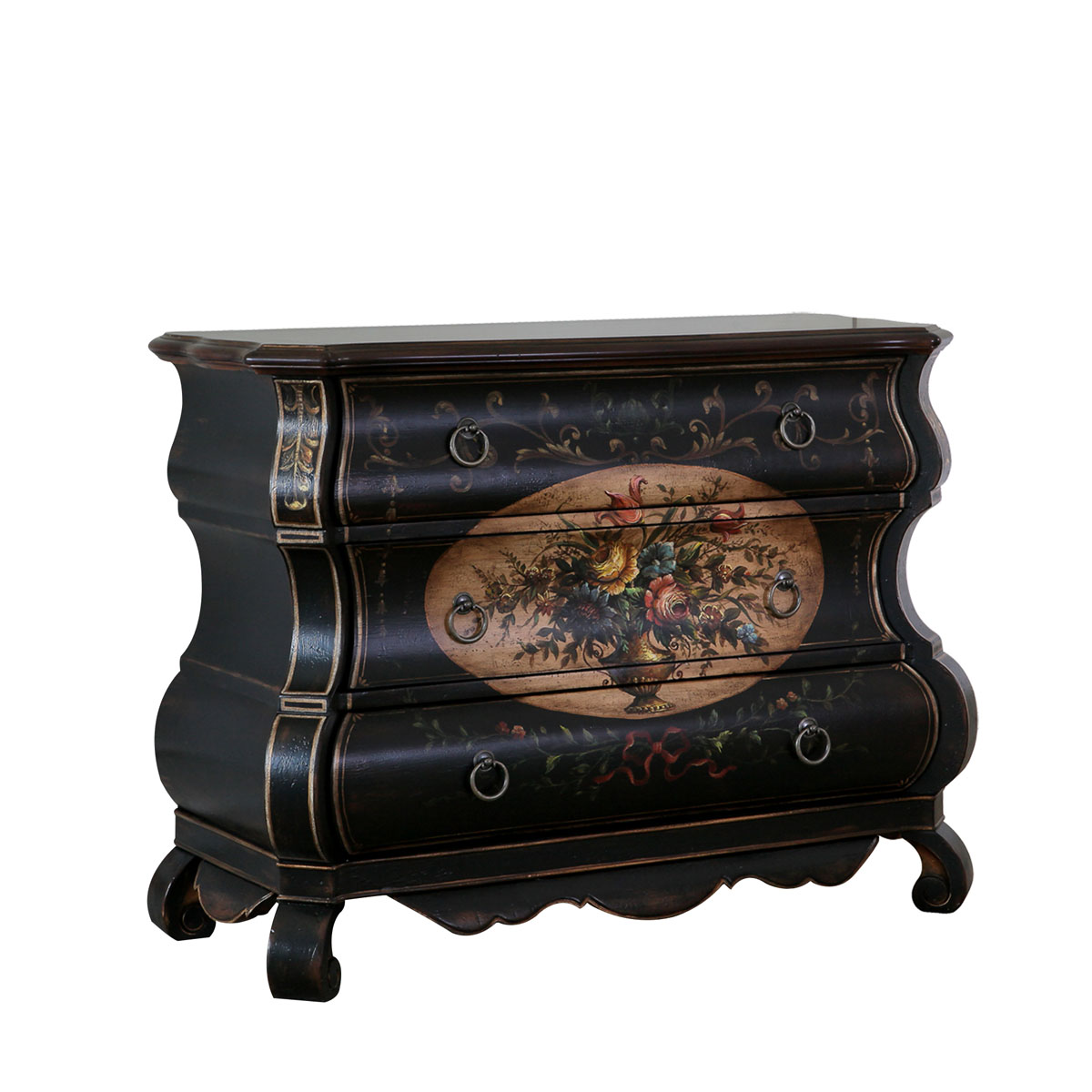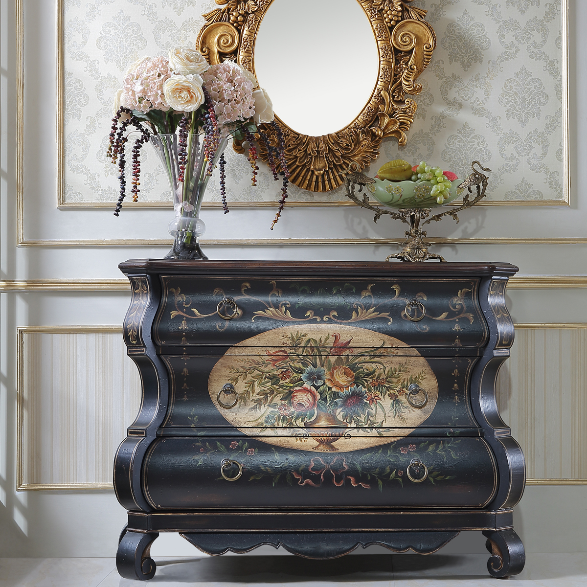 * 结实的连接技术 * 经过专业工艺师绘制的花卉图腾手绘 * 三个储物抽斗,而在其底部采用经典硬木实木滑轨设计;