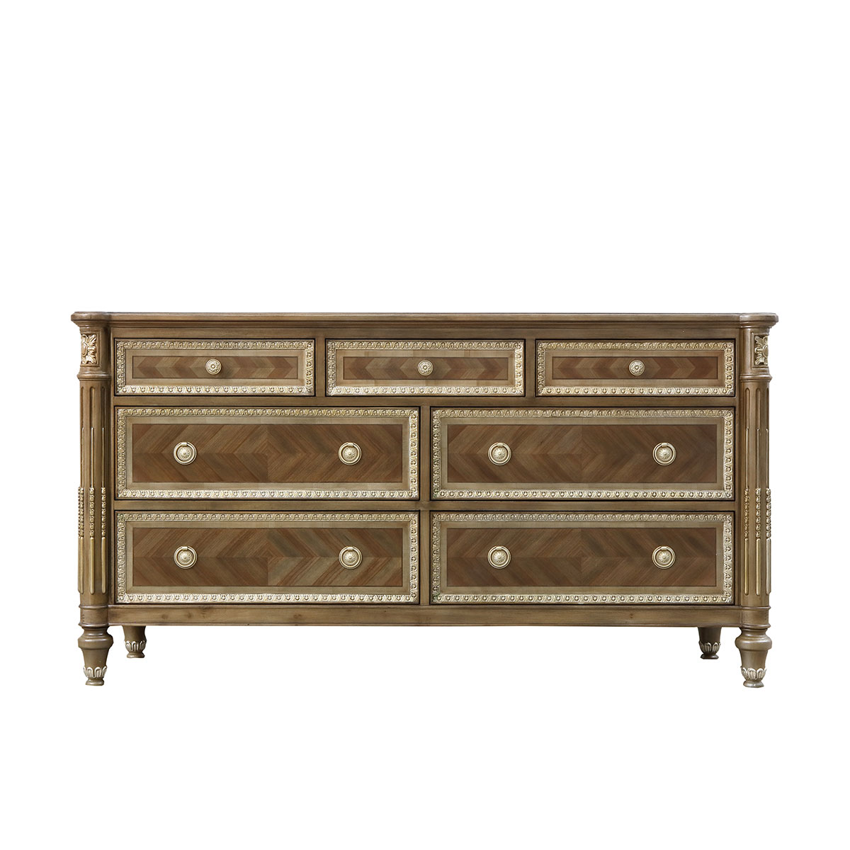 * 为表现法国路易时期的庄严和浪漫,以法国凡尔赛宫为设计元素。使用歌颂路易十四时期的太阳花雕刻,显示其王权稳固地位的锥形腿脚设计,配以钻石图案的木皮贴面、古铜色的球形把手和贴金工艺,完美演绎了法式宫廷悟空体育官网的奢华尊贵。