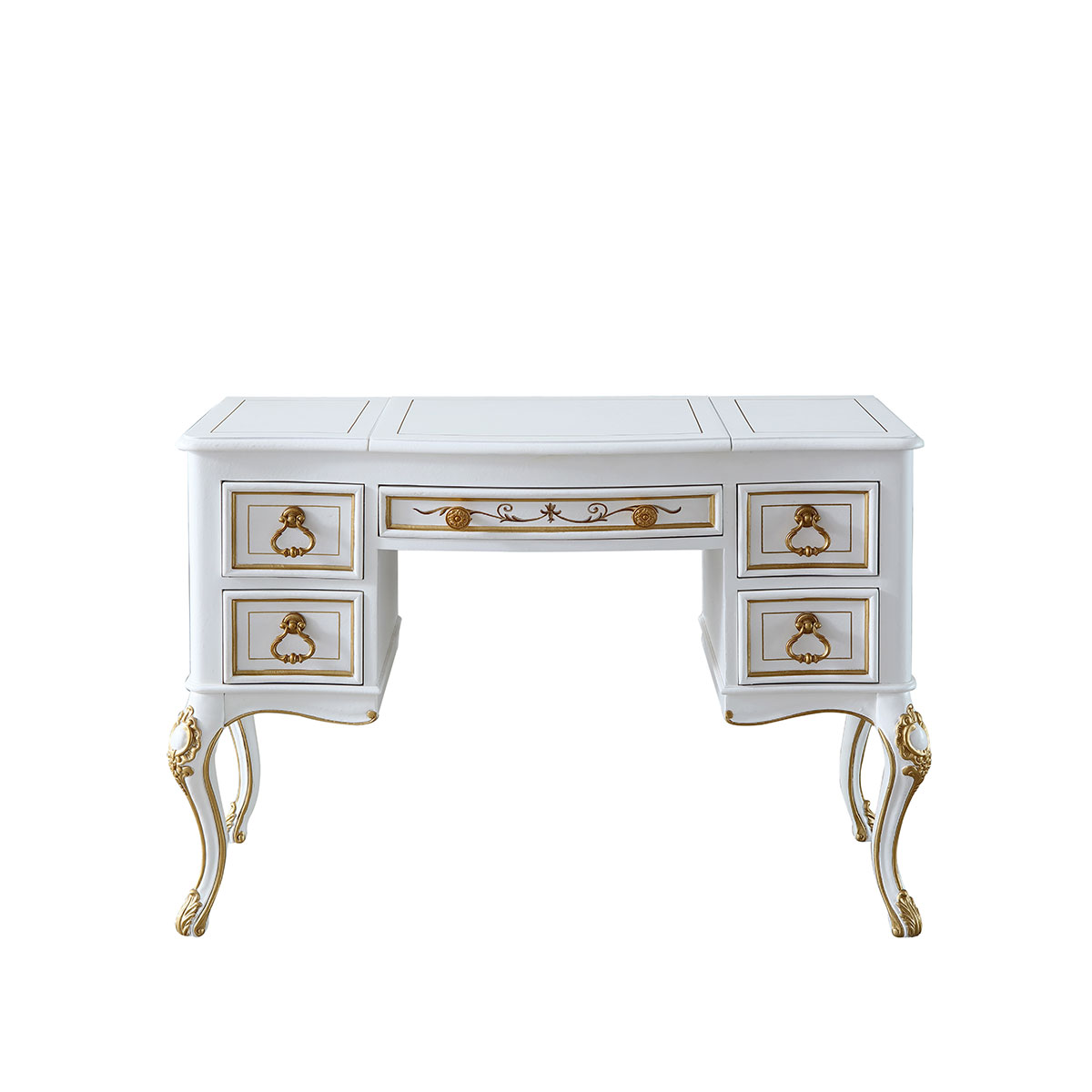 * 四个储物抽斗,底部采用硬木实木滑轨.中间抽斗的设计可翻下斗面,用来放置键盘,抽斗内侧有电线孔,抽斗两边装有两条三节消声铁滑轨,滑顺耐用; * 中间面板可打开,里面有镜子和绒布戒指格; * 脚底部装有可调脚钉