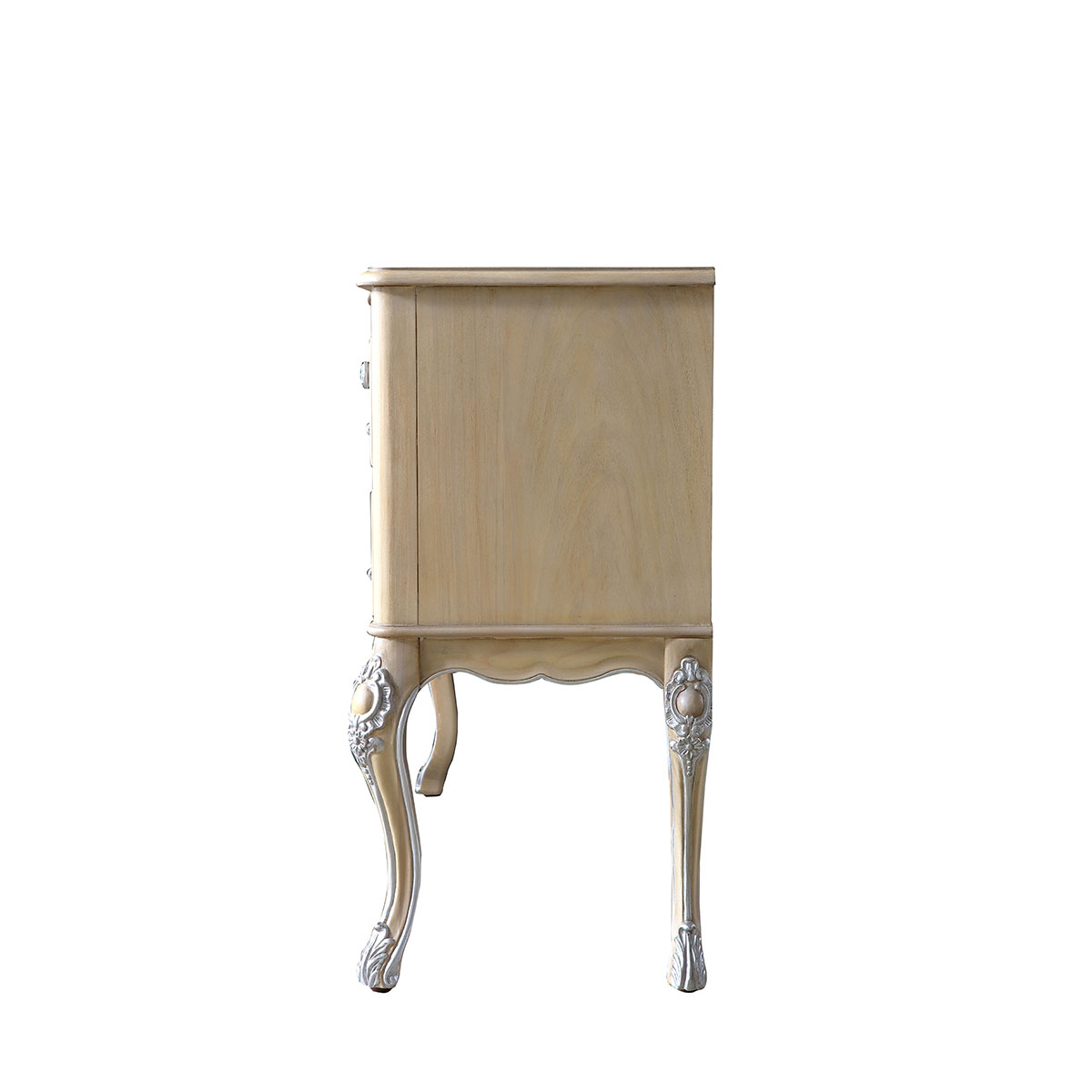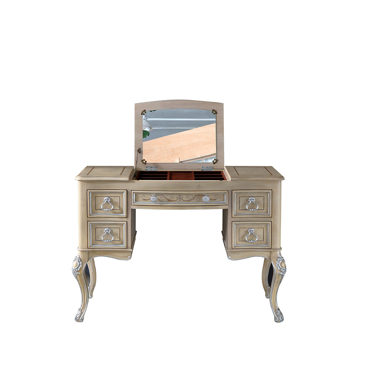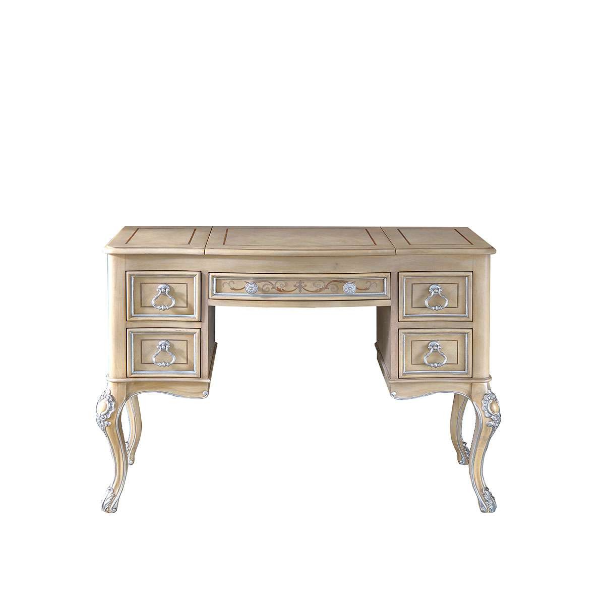 * 四个储物抽斗,底部采用硬木实木滑轨.中间抽斗的设计可翻下斗面,用来放置键盘,抽斗内侧有电线孔,抽斗两边装有两条三节消声铁滑轨,滑顺耐用; * 中间面板可打开,里面有镜子和绒布戒指格; * 脚底部装有可调脚钉