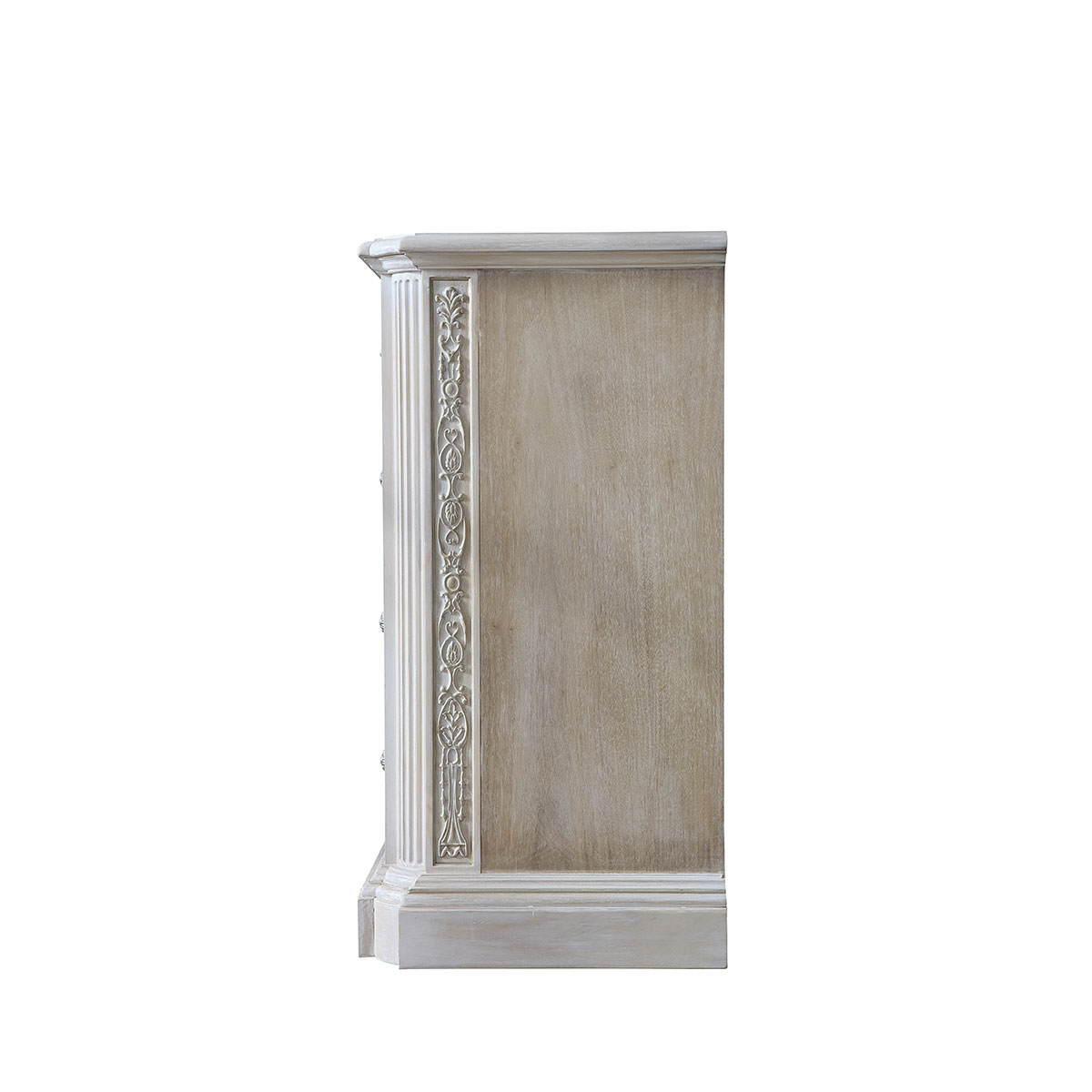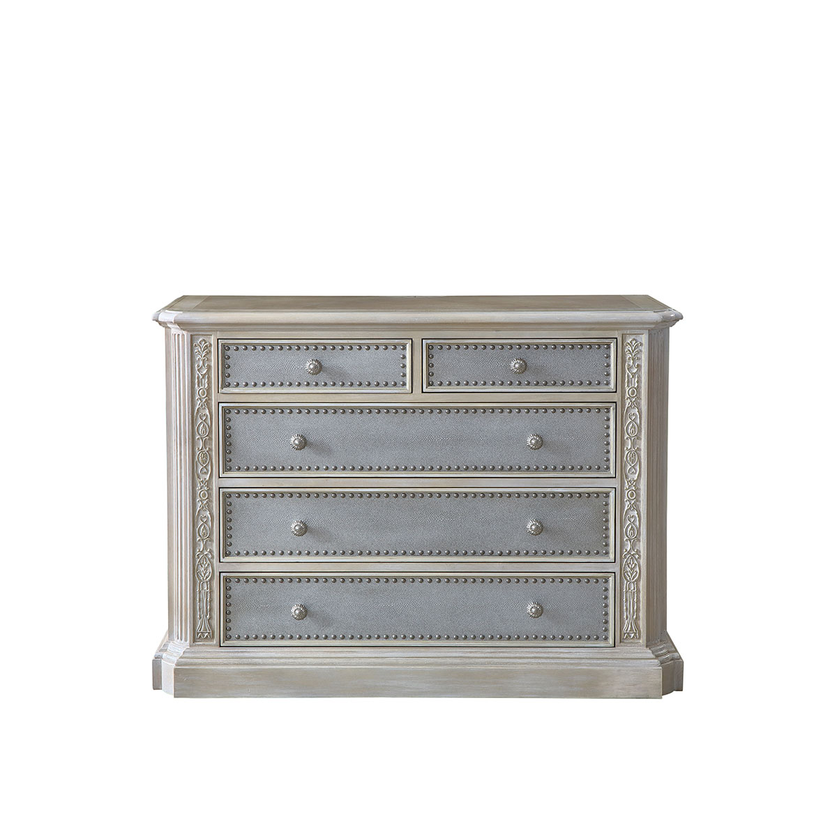 充满优雅与绅士魅力的华盛顿香槟银漆涂装五斗柜,蹄型的底座,庄重稳固;玻璃为画板,银箔压花,在复古彩绘色调中倾注人性情感,原本单调的美便生动了起来。使它不论从任何角度欣赏,都愈加美不胜收。