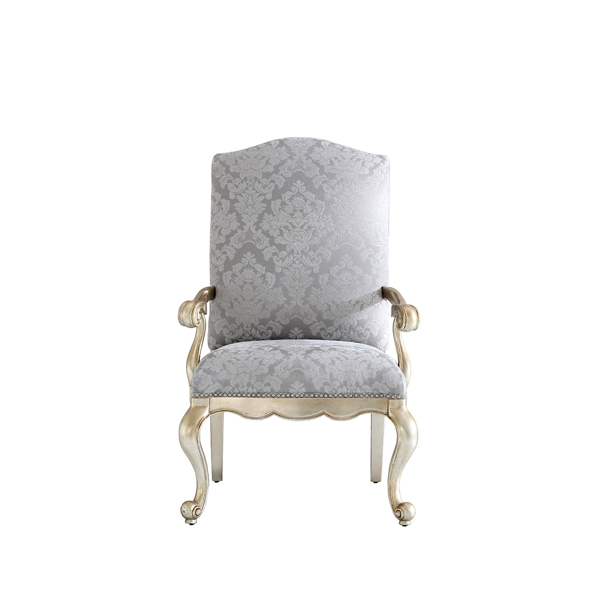 * 一款集合法式元素包括Camelback Silhouette(驼峰轮廓)造型、旋涡形扶手和S形弯脚的高背休闲椅,并配上触感舒适的布艺和包有丰厚的填充物坐垫和靠背;
