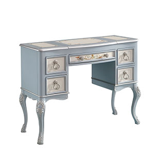 * 四个储物抽斗,底部采用硬木实木滑轨.中间抽斗的设计可翻下斗面,用来放置键盘,抽斗内侧有电线孔,抽斗两边装有两条三节消声铁滑轨,滑顺耐用; * 中间面板可打开,里面有镜子和绒布戒指格; * 脚底部装有可调脚钉