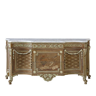 * 手工雕刻的工艺细节结实的连接技术18道以上的多步骤油漆工艺;* 顶上装有适合中国内地使用的灯泡,触摸式开关* 下座边上两个边斗,边斗侧面装有合页;有铁刹车控制抽斗的拉出范围,以达到安全,而在其底部采用经典硬木实木滑轨设计; * 下座中间两个储物抽斗,采用硬木实木滑轨