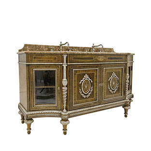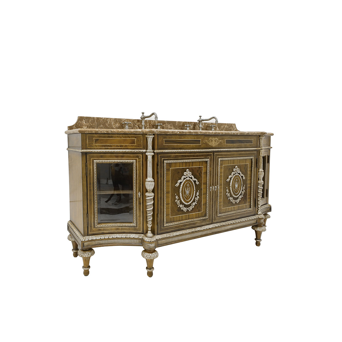 来自中世纪英国温莎城堡的亲切问候,独特的手工花纹藤蔓雕刻,精致的桃花芯木与黑胡桃木皮贴面带出材质高贵质感,光滑的盥洗瓷器与温润实木相辅相成,释放皇权贵族的生命热度。