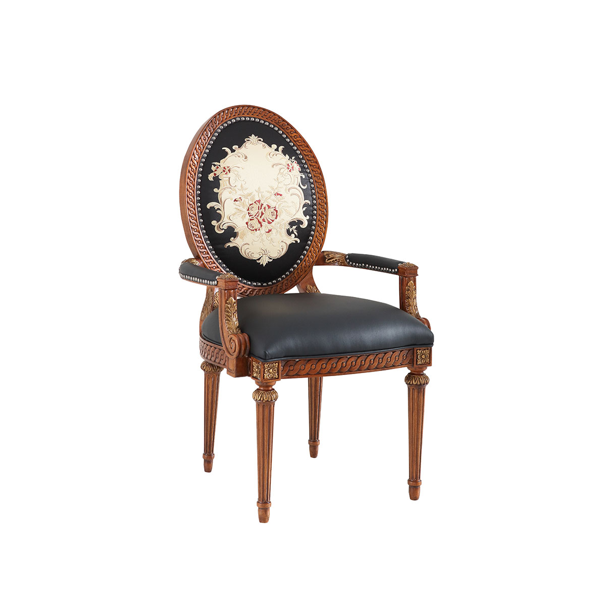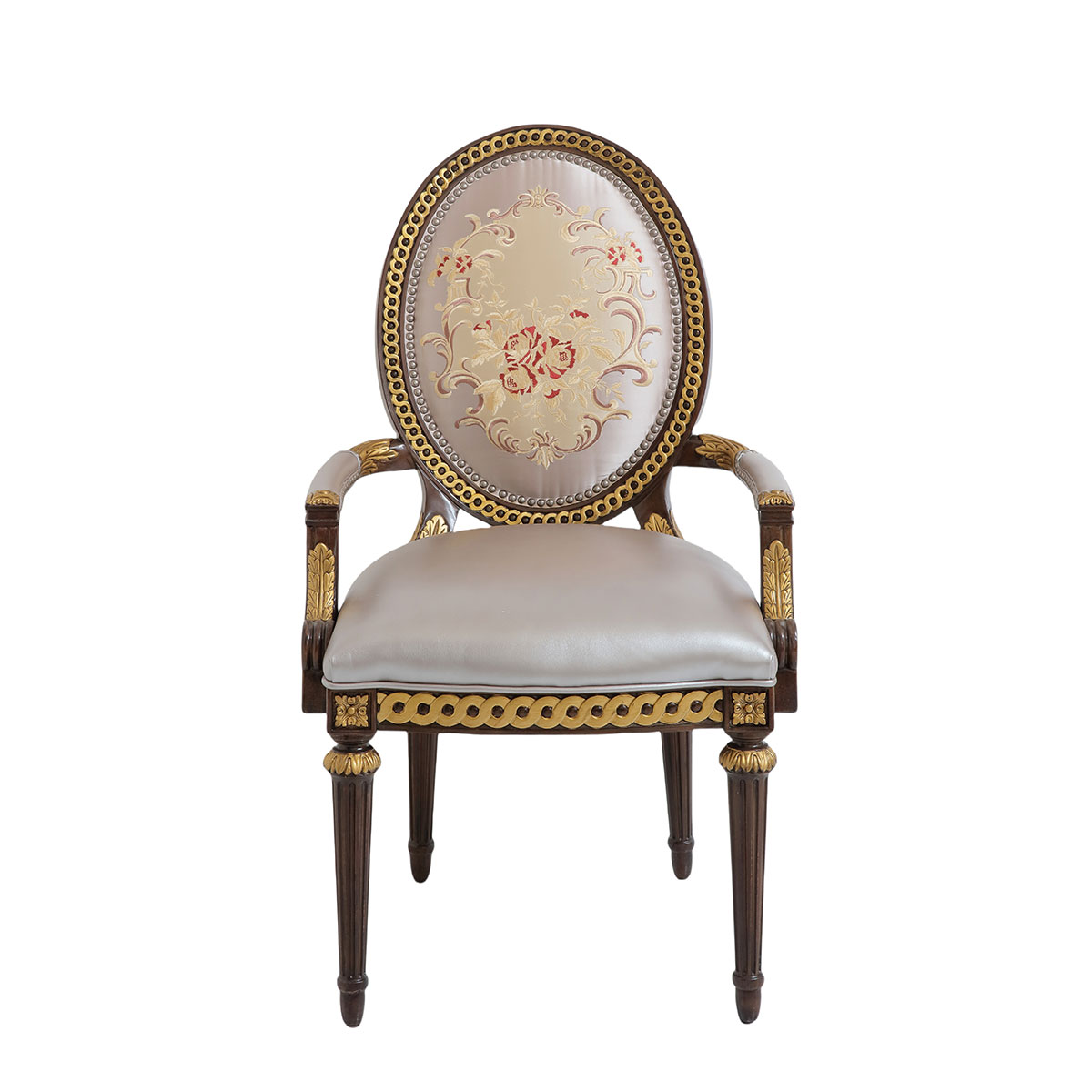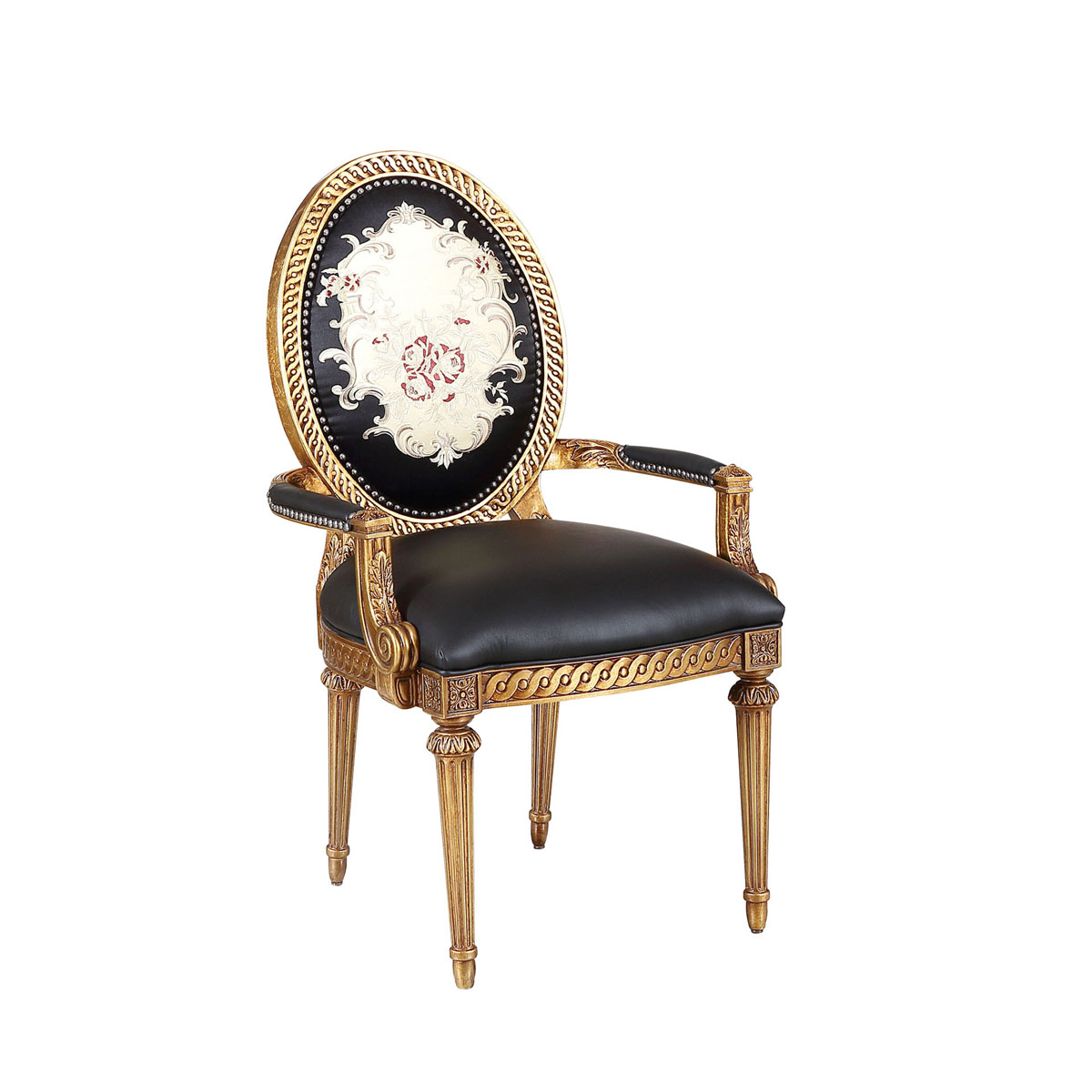 参考18世纪法国路易十六时期涂金扶手椅古董设计,并结合同时期的圆面背板设计。配上精致的连续雕刻和贴金铂工艺、锥形脚设计、触感舒适的布艺和包有丰厚的填充物坐垫和靠背。