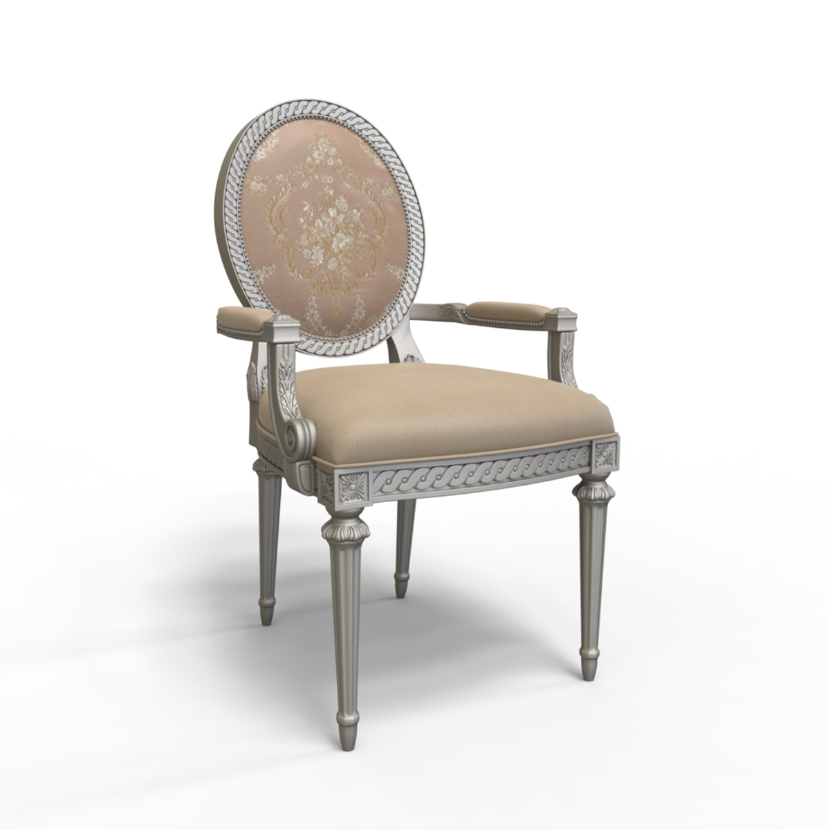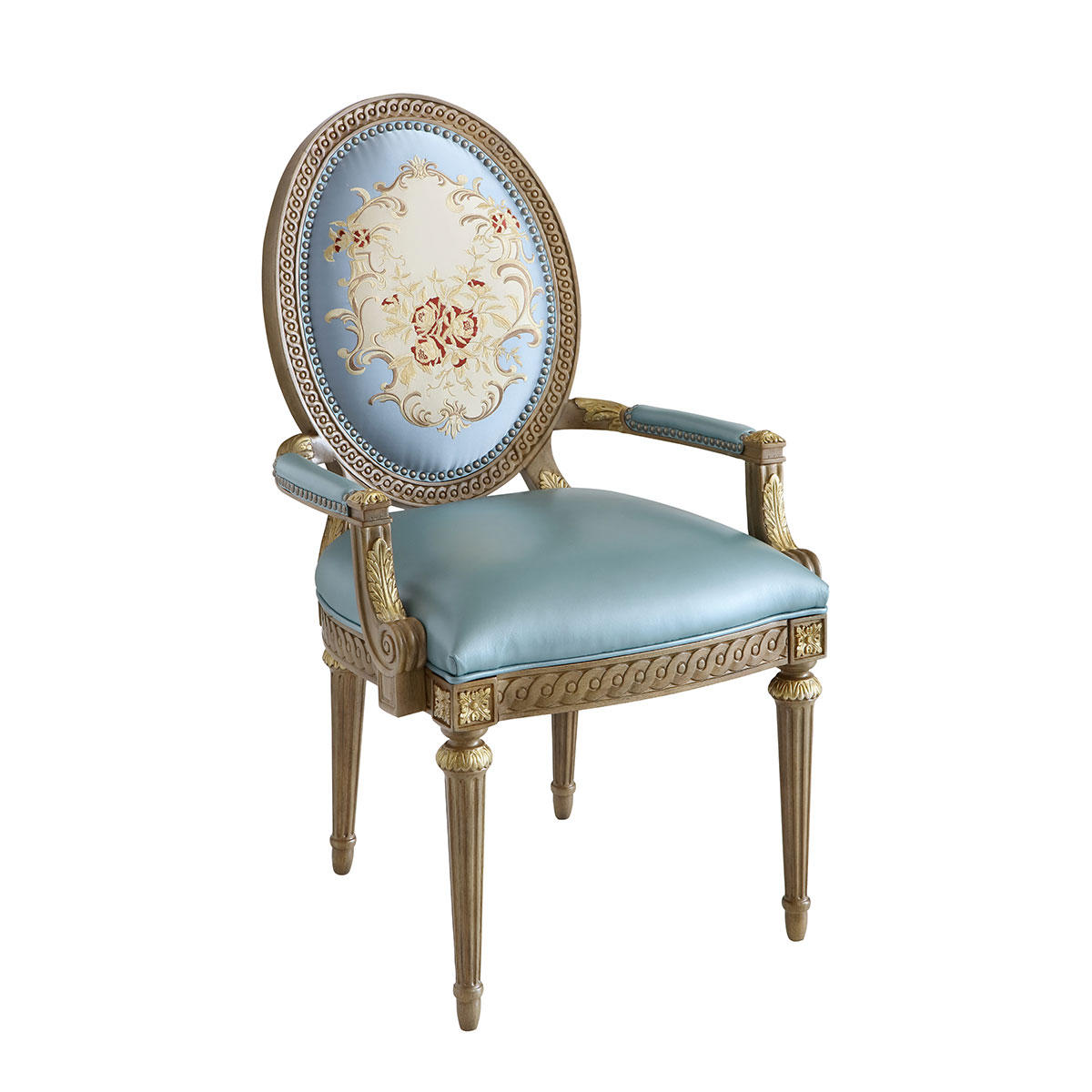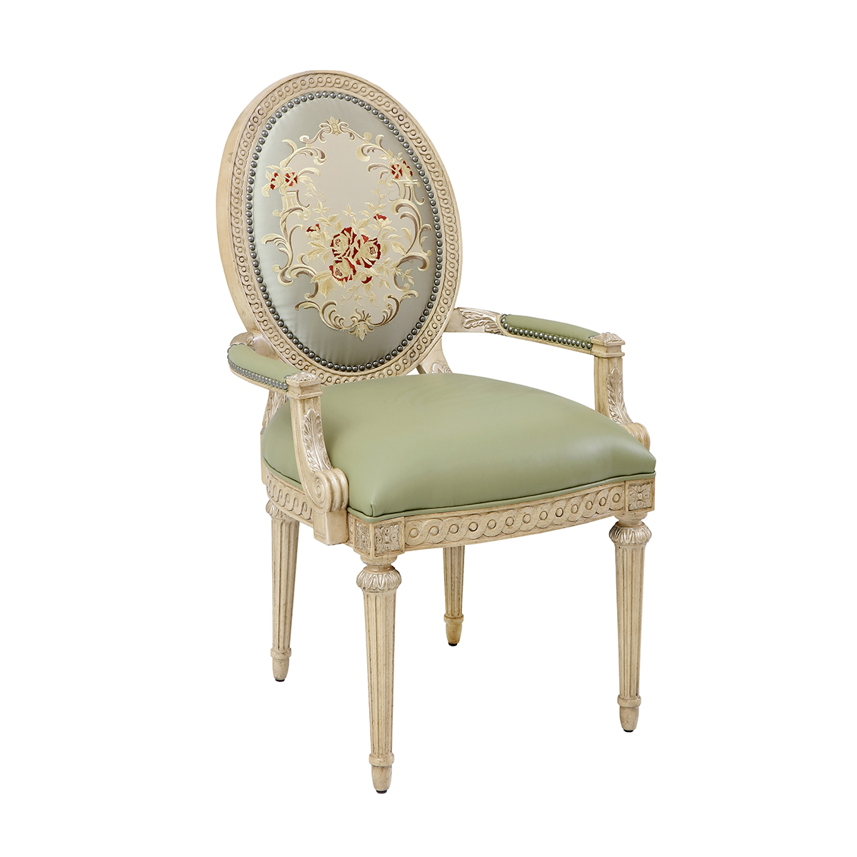 参考18世纪法国路易十六时期涂金扶手椅古董设计,并结合同时期的圆面背板设计。配上精致的连续雕刻和贴金铂工艺、锥形脚设计、触感舒适的布艺和包有丰厚的填充物坐垫和靠背。