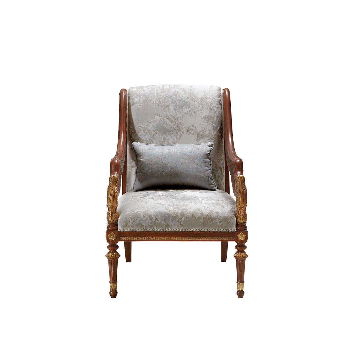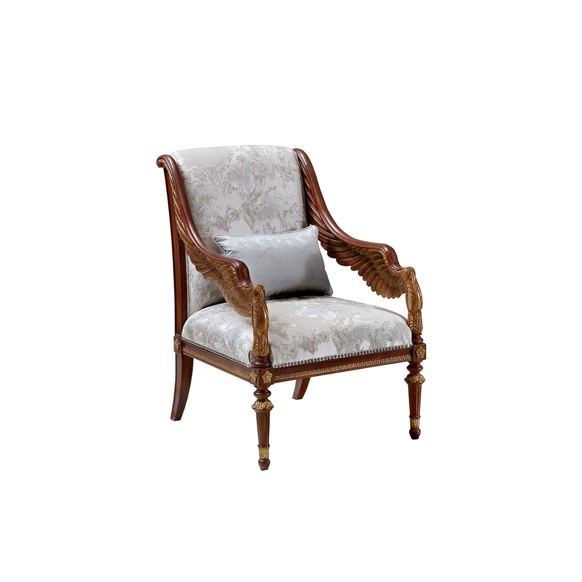 以现保存在法国"卢浮宫"的 “胜利女神像”为意念,并结合意大利强调帝权象征的帝国EMPIRE风格元素中翅膀造型,设计雕刻出胜利女神-Samothrace翅膀扶手,羽翼丰满的羽毛雕刻极为精巧经典,栩栩如生,复兴你的典雅情怀。