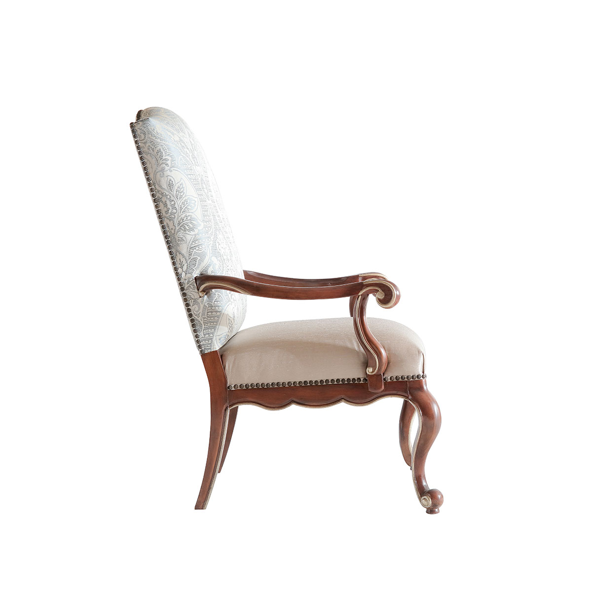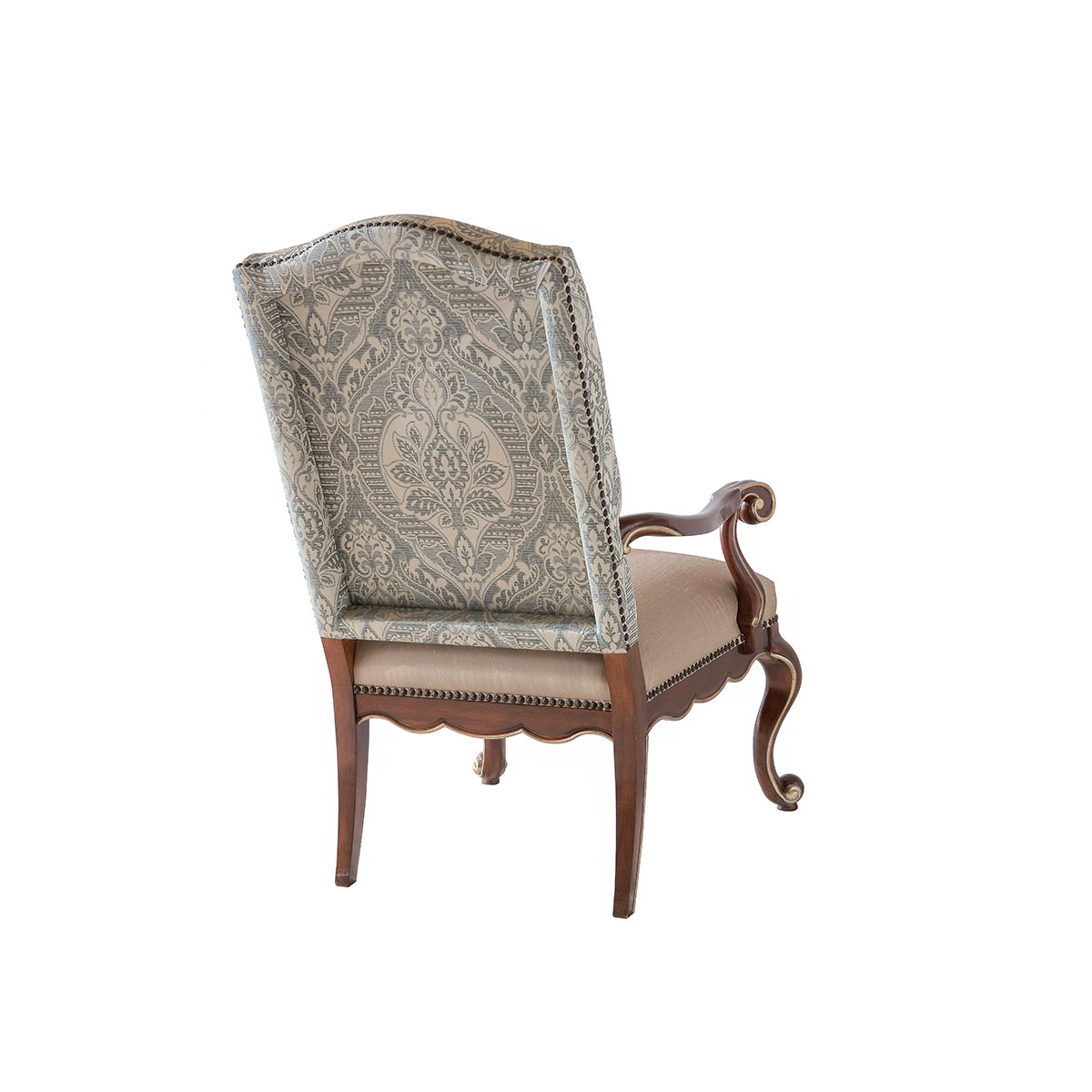 一款集合法式元素包括Camelback Silhouette(驼峰轮廓)造型、旋涡形扶手和S形弯脚的高背休闲椅,并配上触感舒适的布艺和包有丰厚的填充物坐垫和靠背。