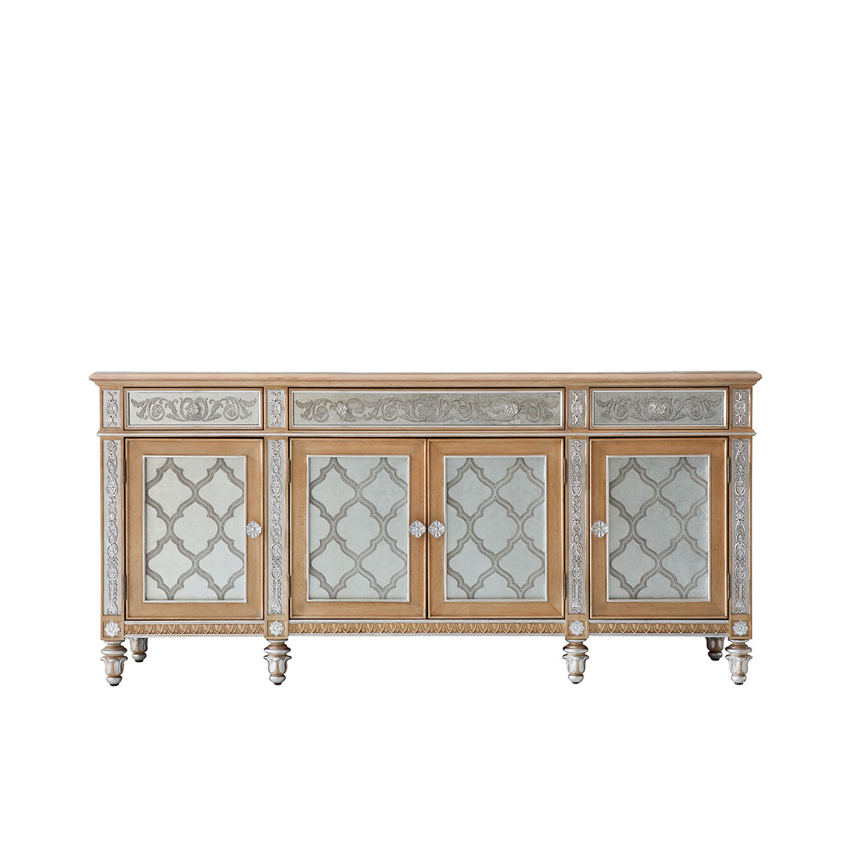 橡胶木+环保人造板+黑胡桃+艳阳花+樱桃木等木皮贴面+艺术玻璃