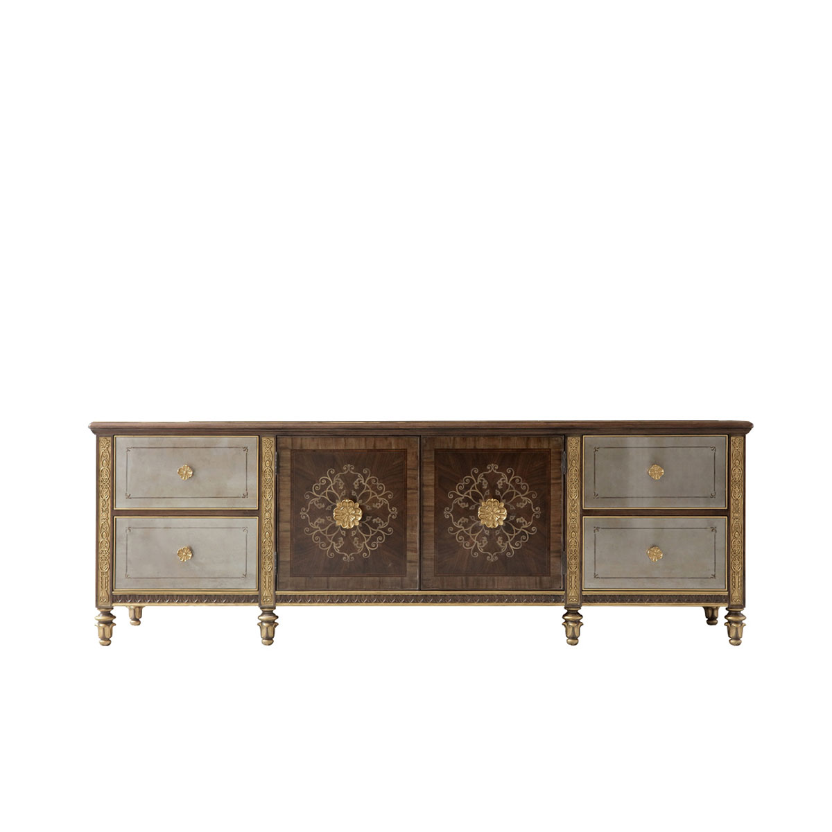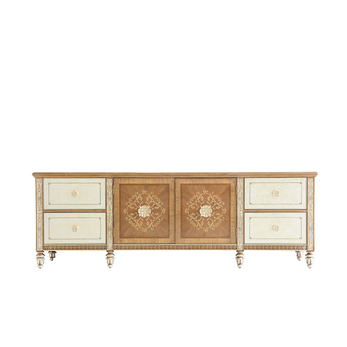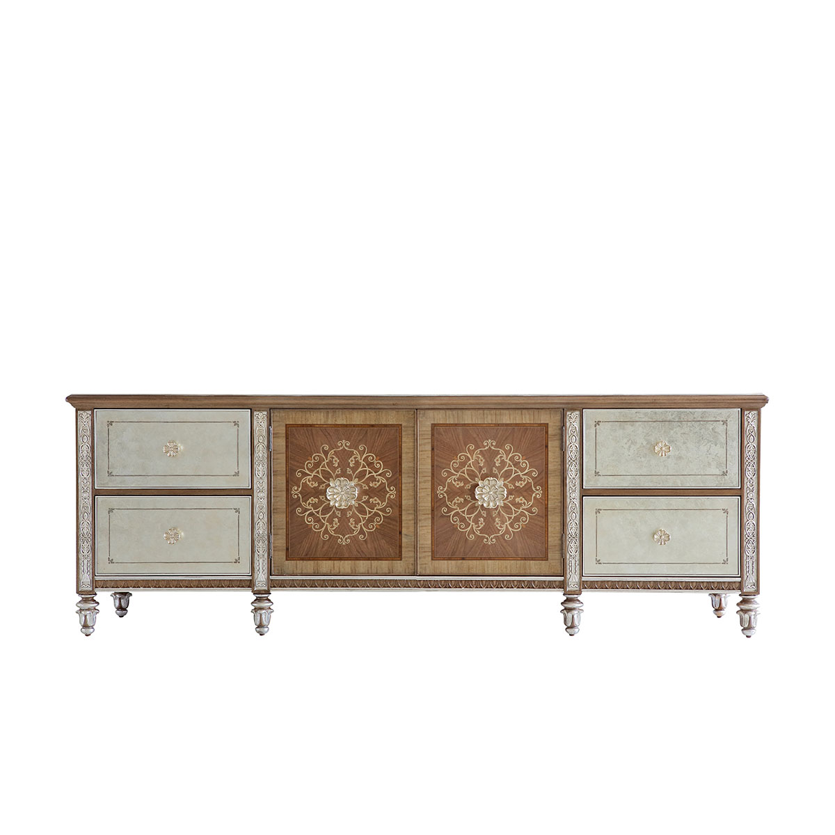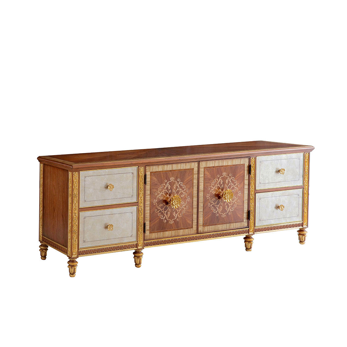橡胶木+环保人造板+黑胡桃+艳阳花+樱桃木等木皮贴面+艺术玻璃
