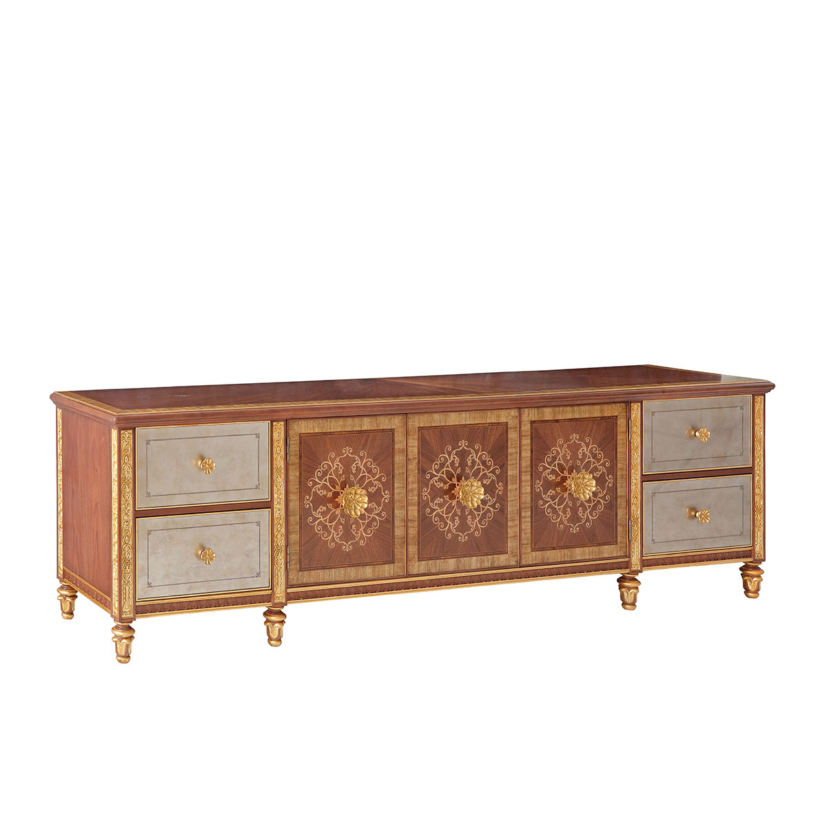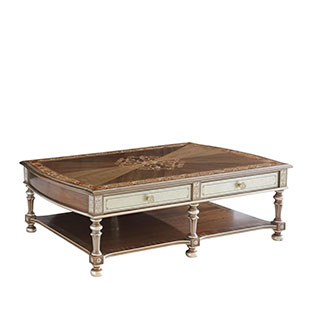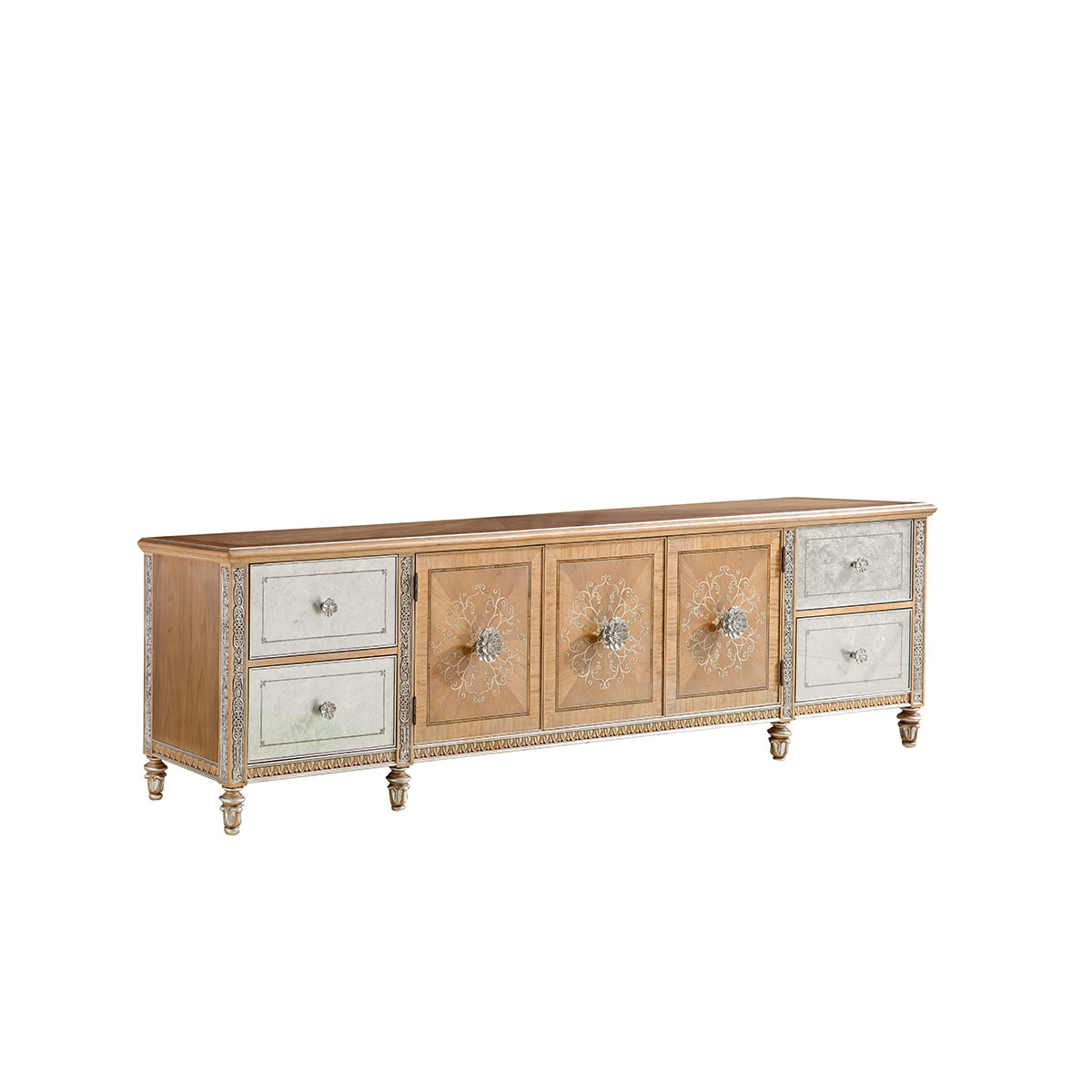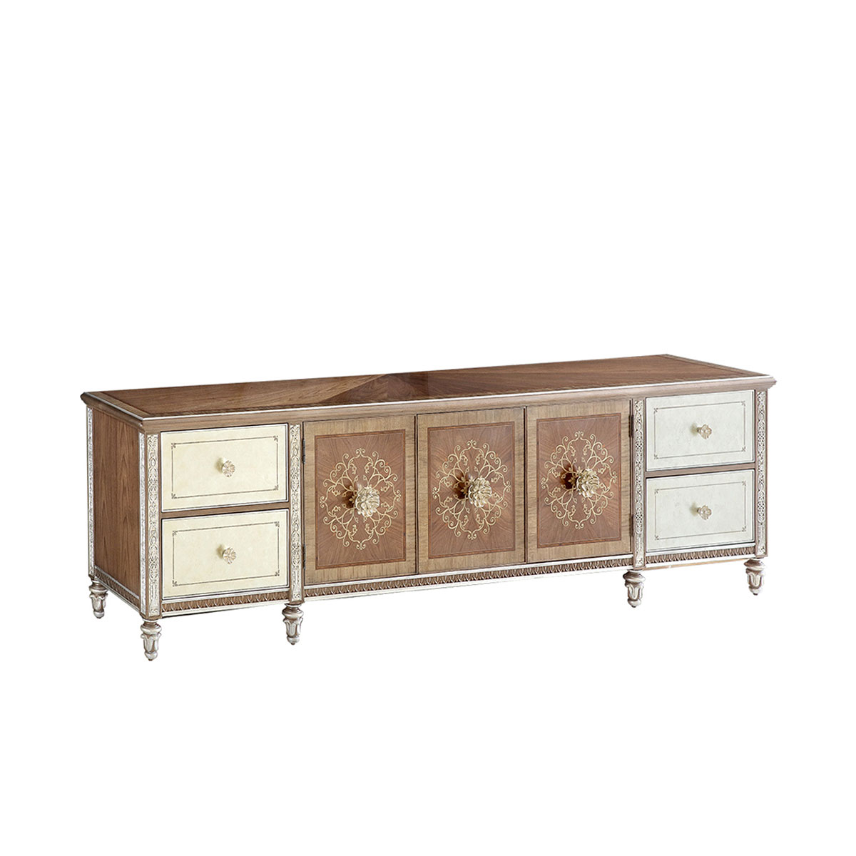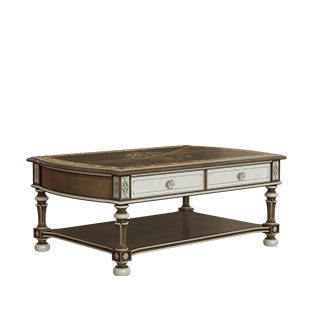 橡胶木+环保人造板+黑胡桃+艳阳花+樱桃木等木皮贴面+艺术玻璃