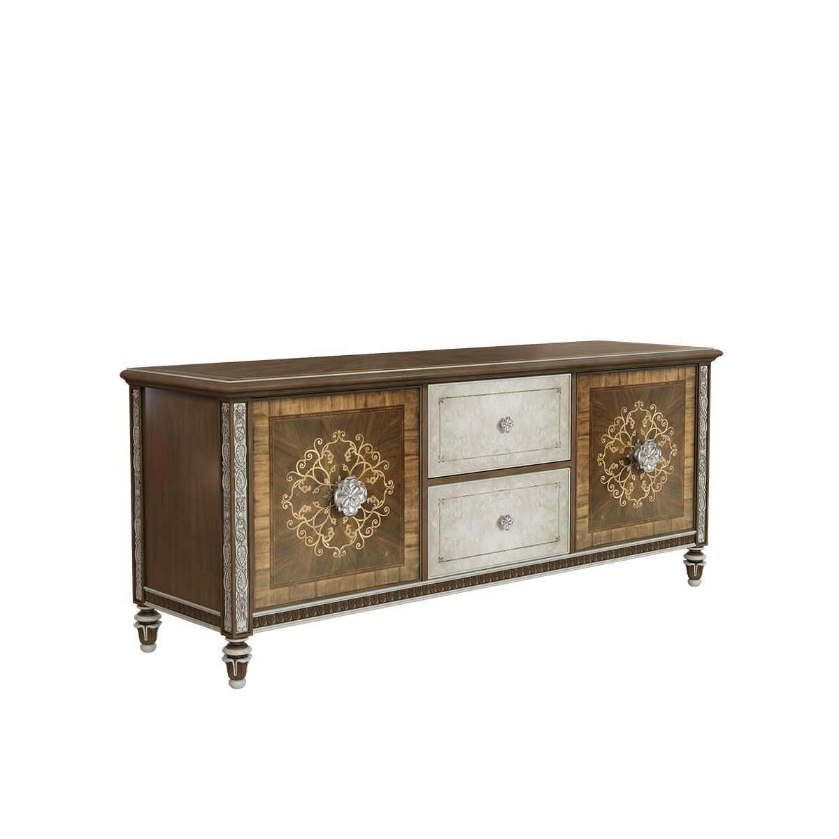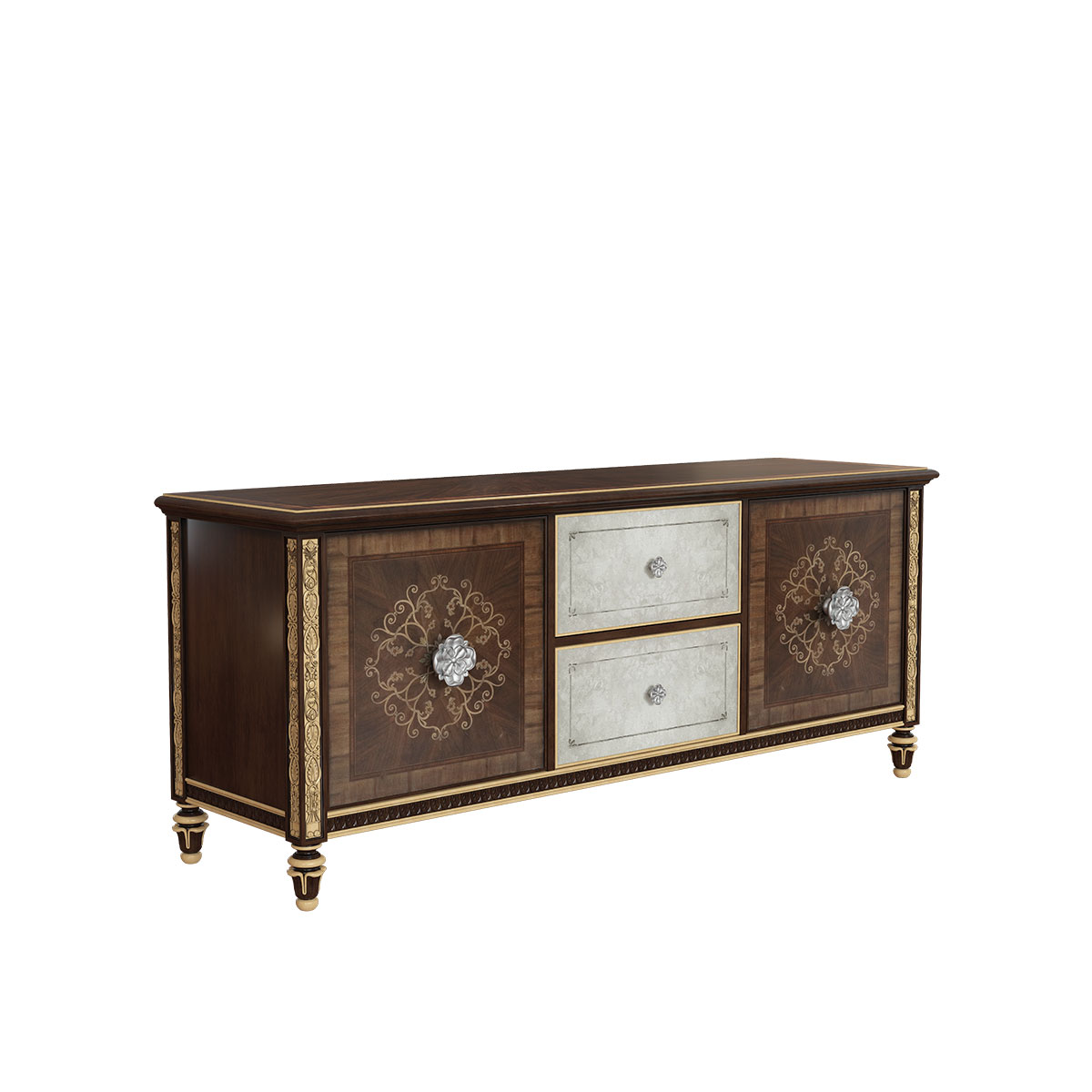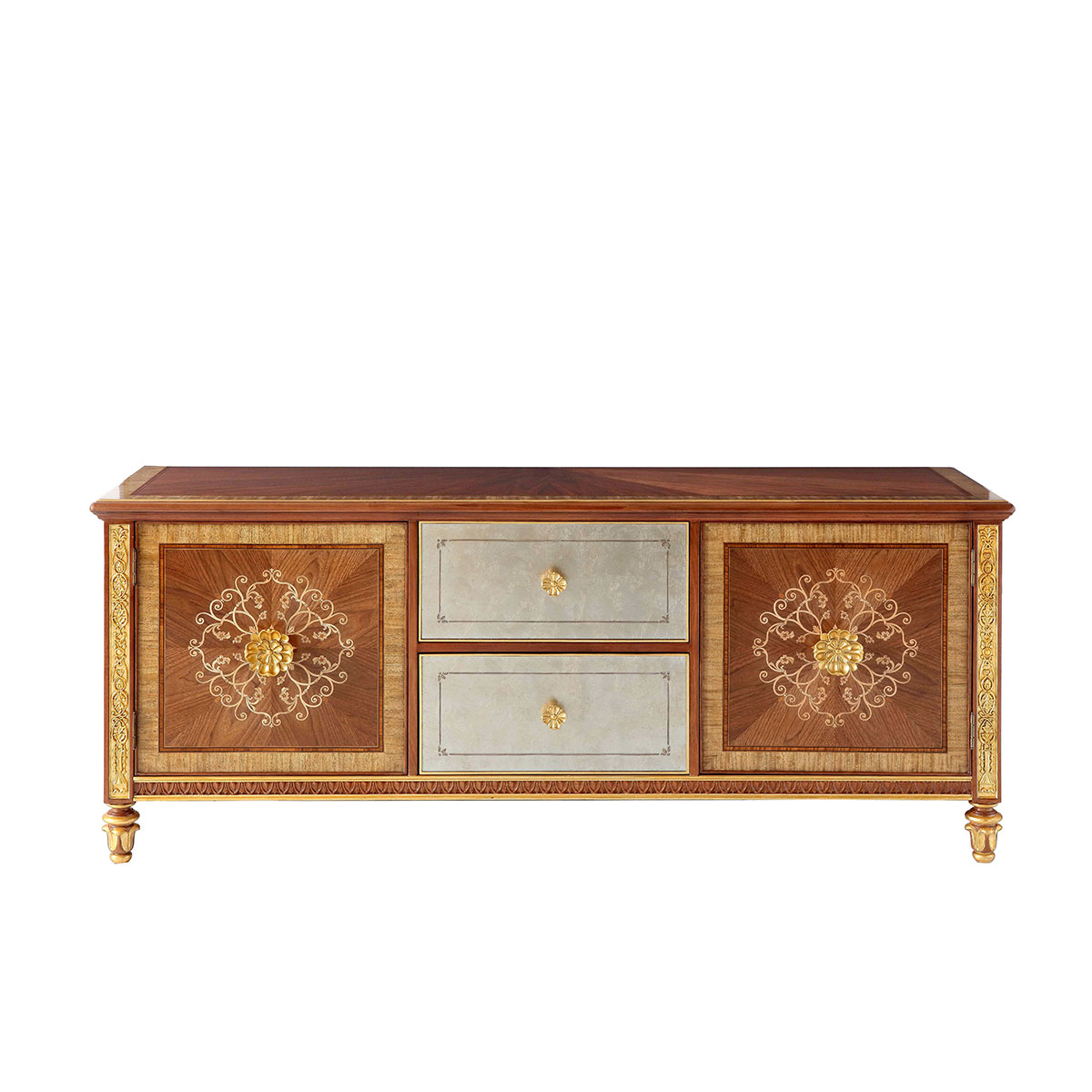 橡胶木+环保人造板+黑胡桃+艳阳花+樱桃木等木皮贴面+艺术玻璃