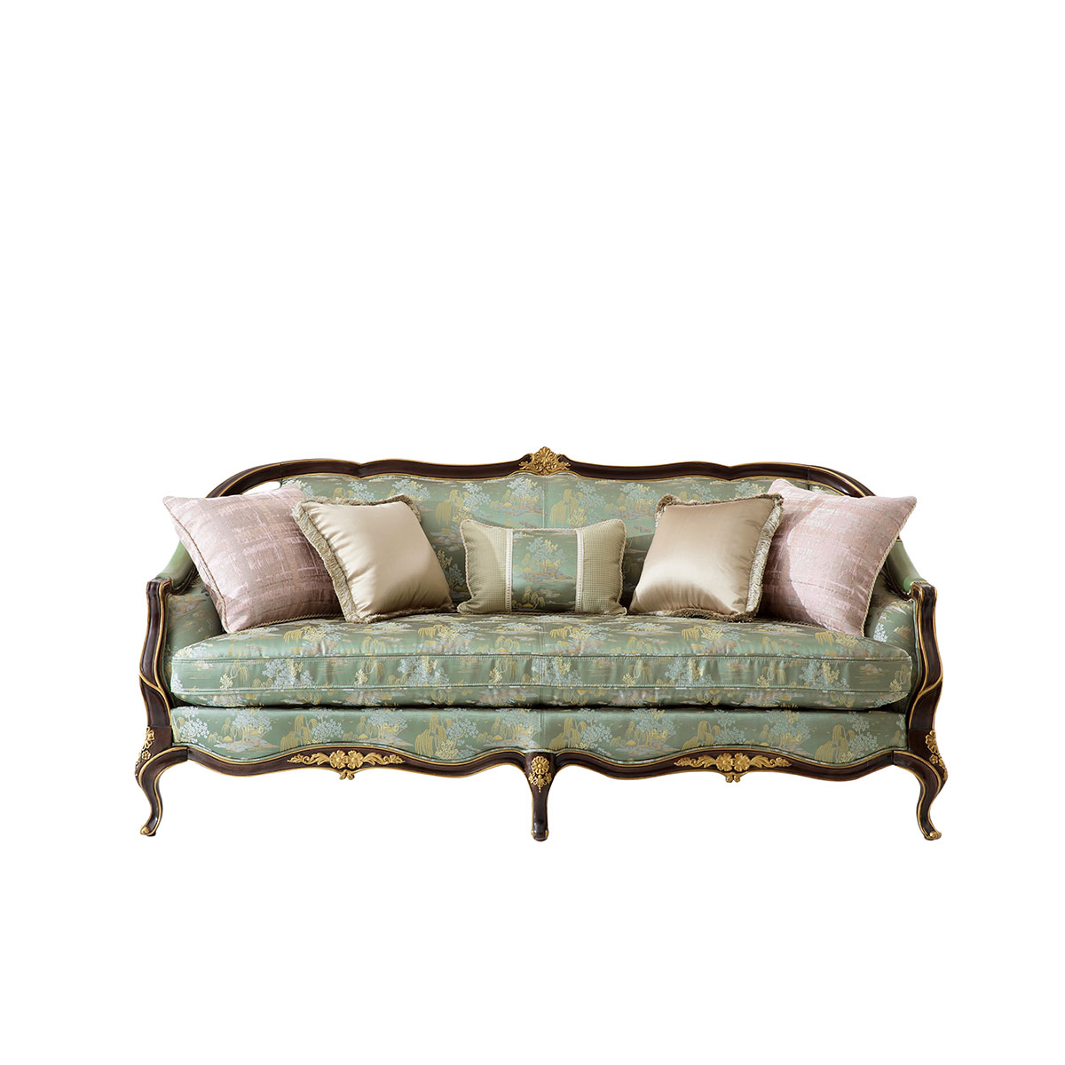 * 沙发外形布满手工实木雕刻的花环和卷叶图案 ; * 6只弯形雕刻脚 * 沙发前方、坐垫及背部包有丰厚的填充物 ; * 扶手设计源于法式经典翼背椅(Wing Back Chair) ; * 标配抱枕:500*500 2个 430*430 2个 320*500 1个; * 提供多种面料选择;
