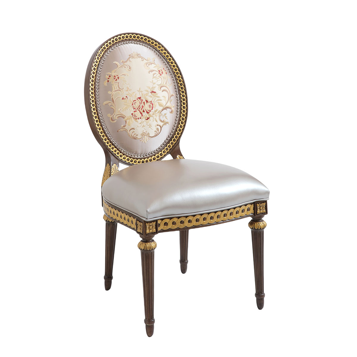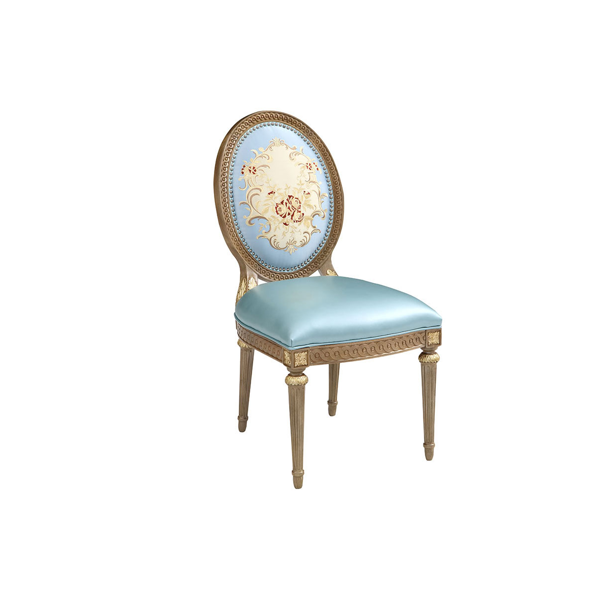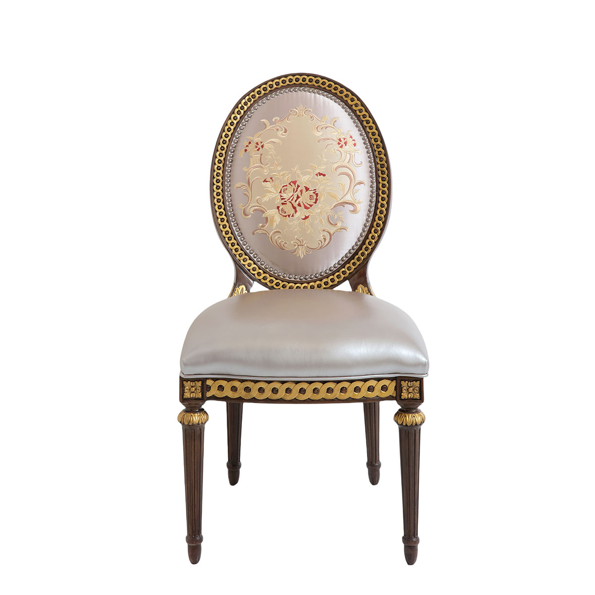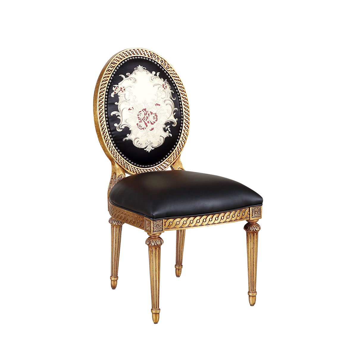 参考18世纪法国路易十六时期涂金扶手椅古董设计,并结合同时期的圆面背板设计。配上精致的连续雕刻和贴金铂工艺、锥形脚设计、触感舒适的布艺和包有丰厚的填充物坐垫和靠背。