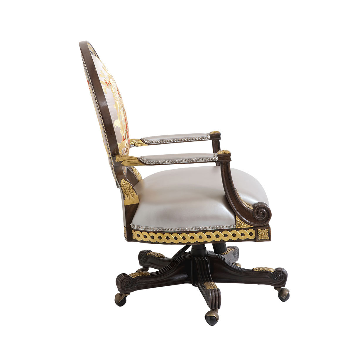参考18世纪法国路易十六时期涂金扶手椅古董设计,并结合同时期的圆面背板设计。配上精致的连续雕刻和贴金铂工艺、锥形脚设计、触感舒适的布艺和包有丰厚的填充物坐垫和靠背。