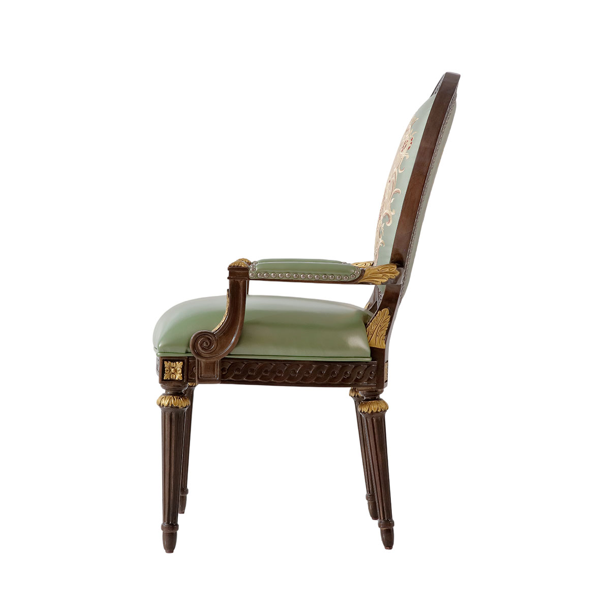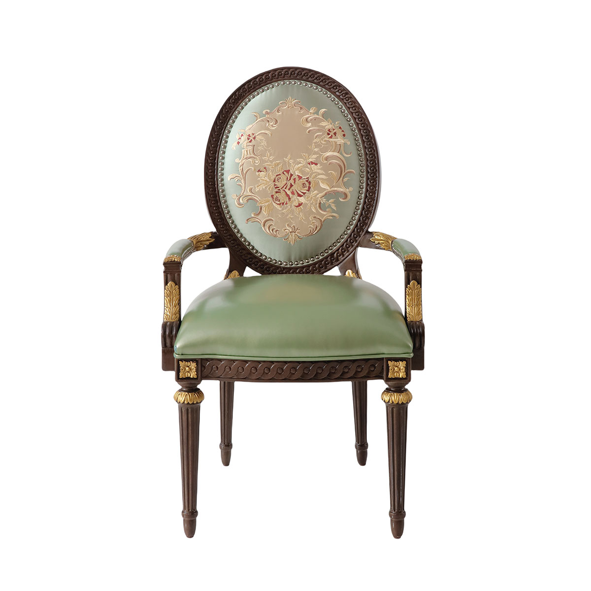 参考18世纪法国路易十六时期涂金扶手椅古董设计,并结合同时期的圆面背板设计。配上精致的连续雕刻和贴金铂工艺、锥形脚设计、触感舒适的布艺和包有丰厚的填充物坐垫和靠背。