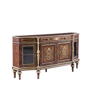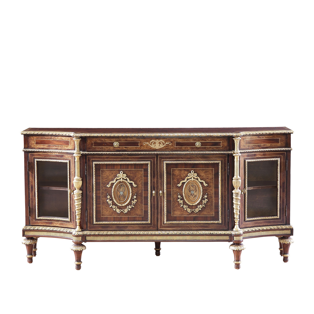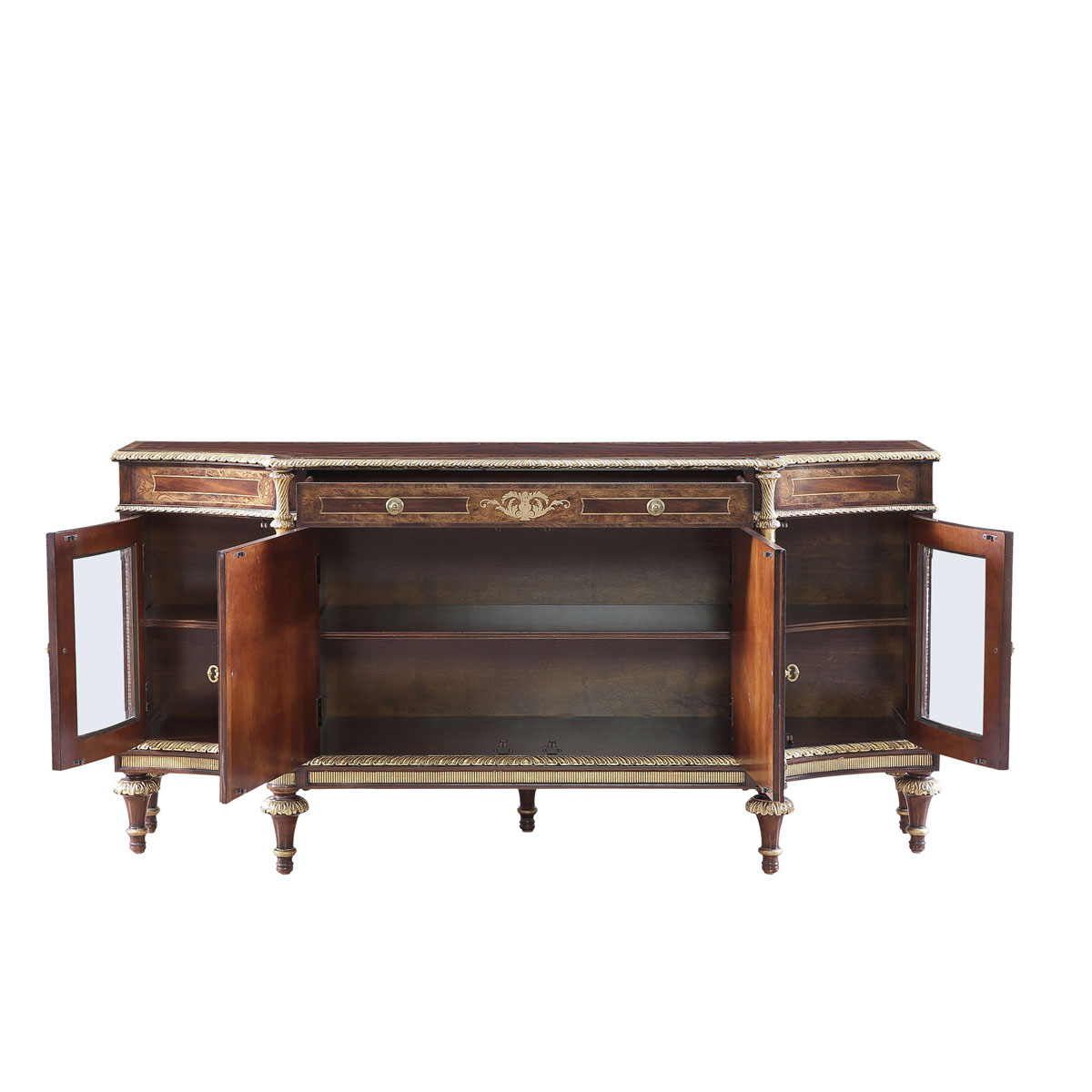 * 精致的手工雕刻细节和贴金工艺; * 一个储物抽斗,底部采用硬木实木滑轨; * 左右两边为实木框玻璃门,四扇门内各有一块可调层板; * 脚底部装有可调脚钉;