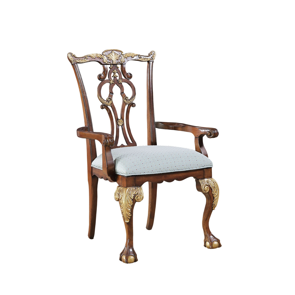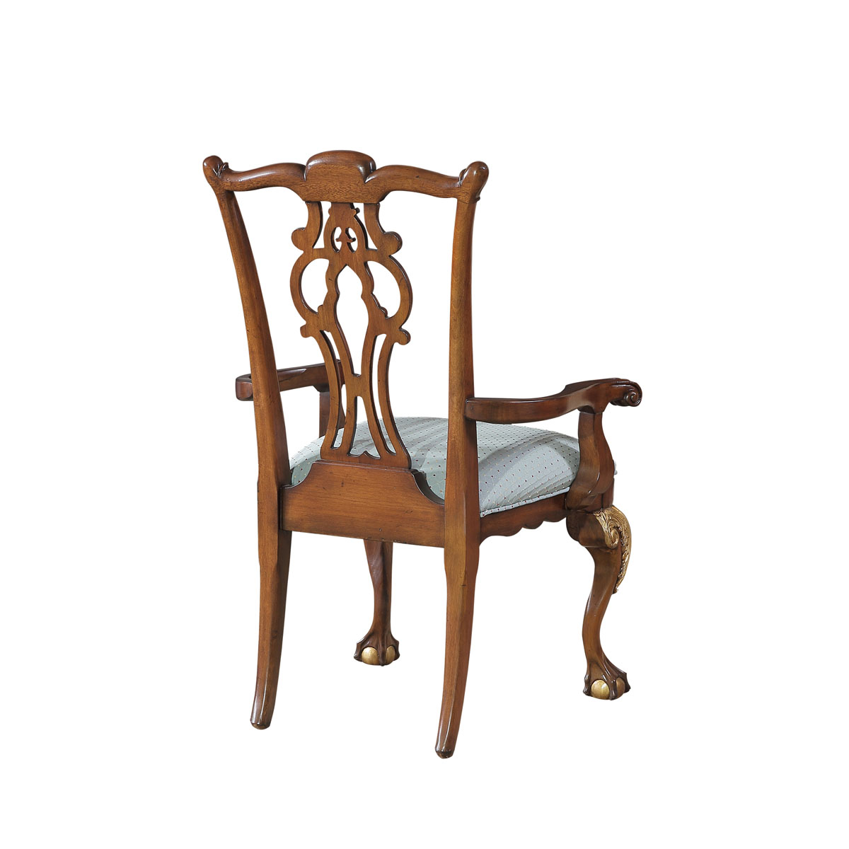 * 为表现英国皇室的华丽和庄严,以英国温莎堡为设计元素。从青花瓷花瓶得到灵感的Chippendale(齐彭代尔式)镂空椅背和与卷叶雕刻结合的兽抓球弯腿设计,表达出王室的尊贵品位。配上精致的手工雕刻细节和贴金箔工艺,是豪华系列温莎堡英式扶手椅的特色。