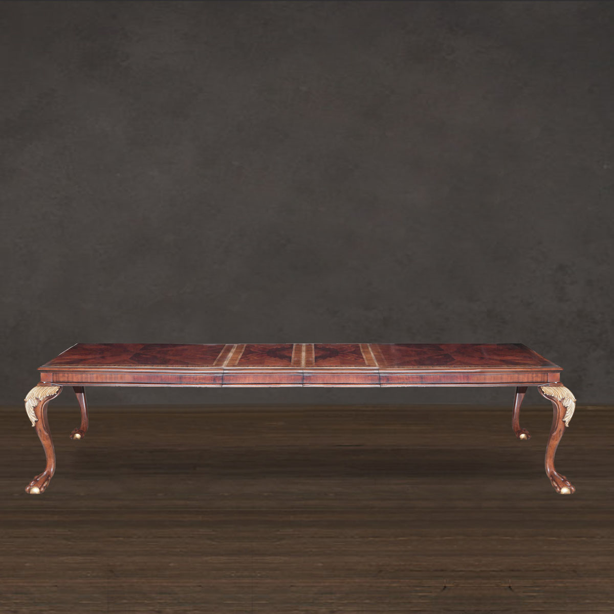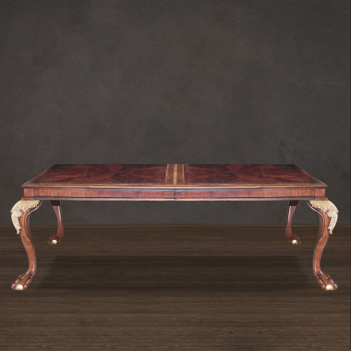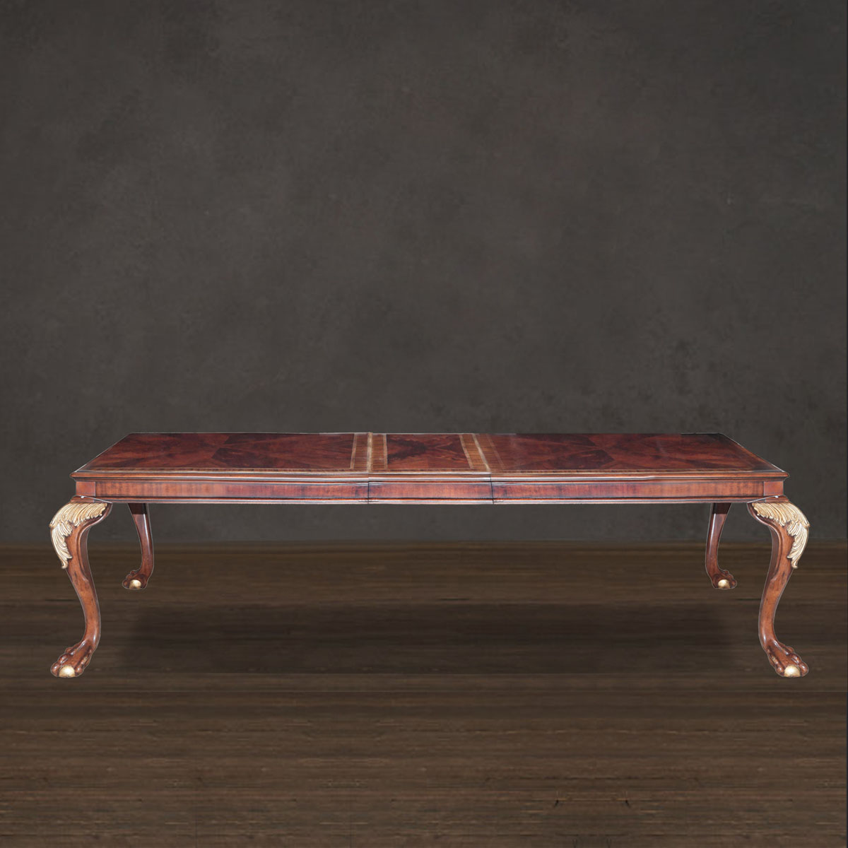 * 为表现英国皇室的华丽和庄严,以英国温莎堡为设计元素。采用经典的 Chippendale(齐彭代尔式)兽抓球弯腿设计、卷叶雕刻和贴金工艺,配上可调节的伸板设计与精美的木皮贴面图案,完美演绎了英式宫廷悟空体育官网的奢华尊贵,可谓是极具典藏价值的传世之作。