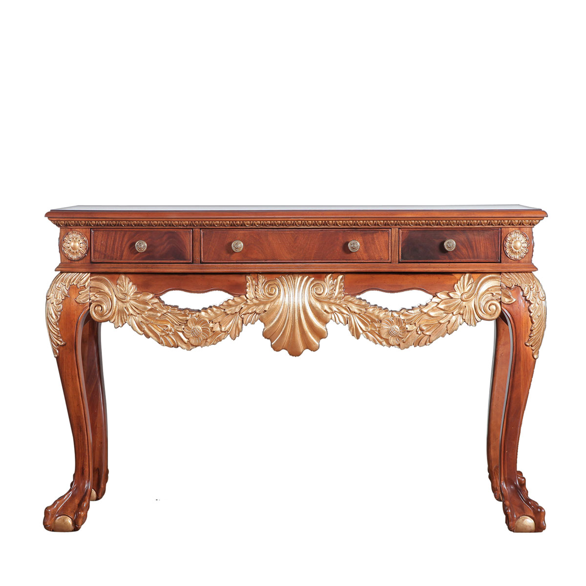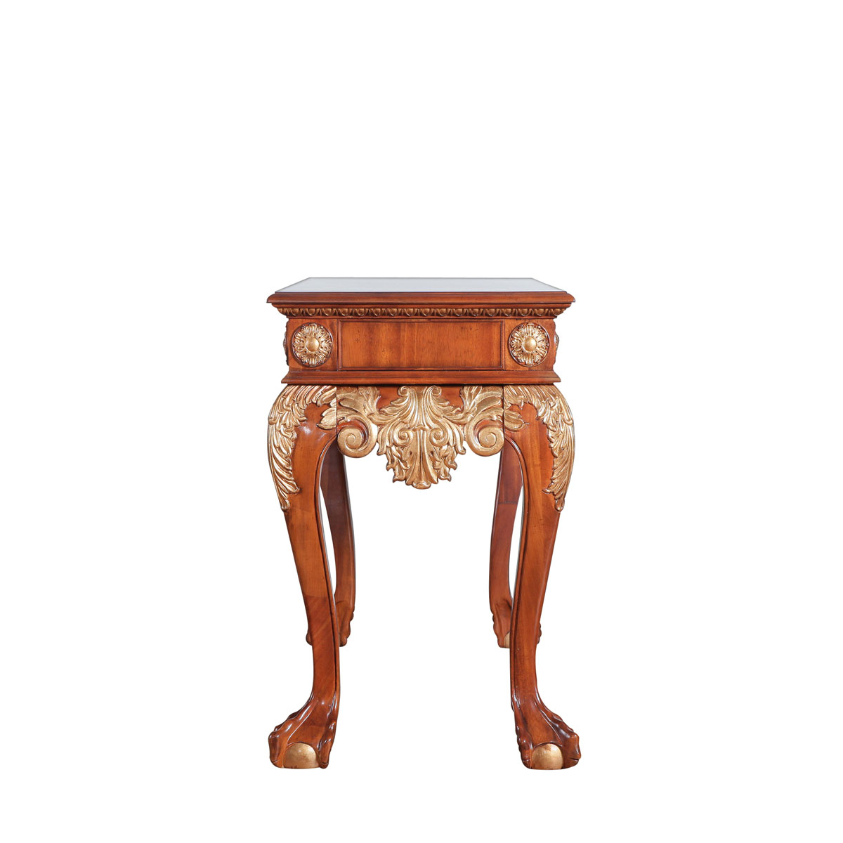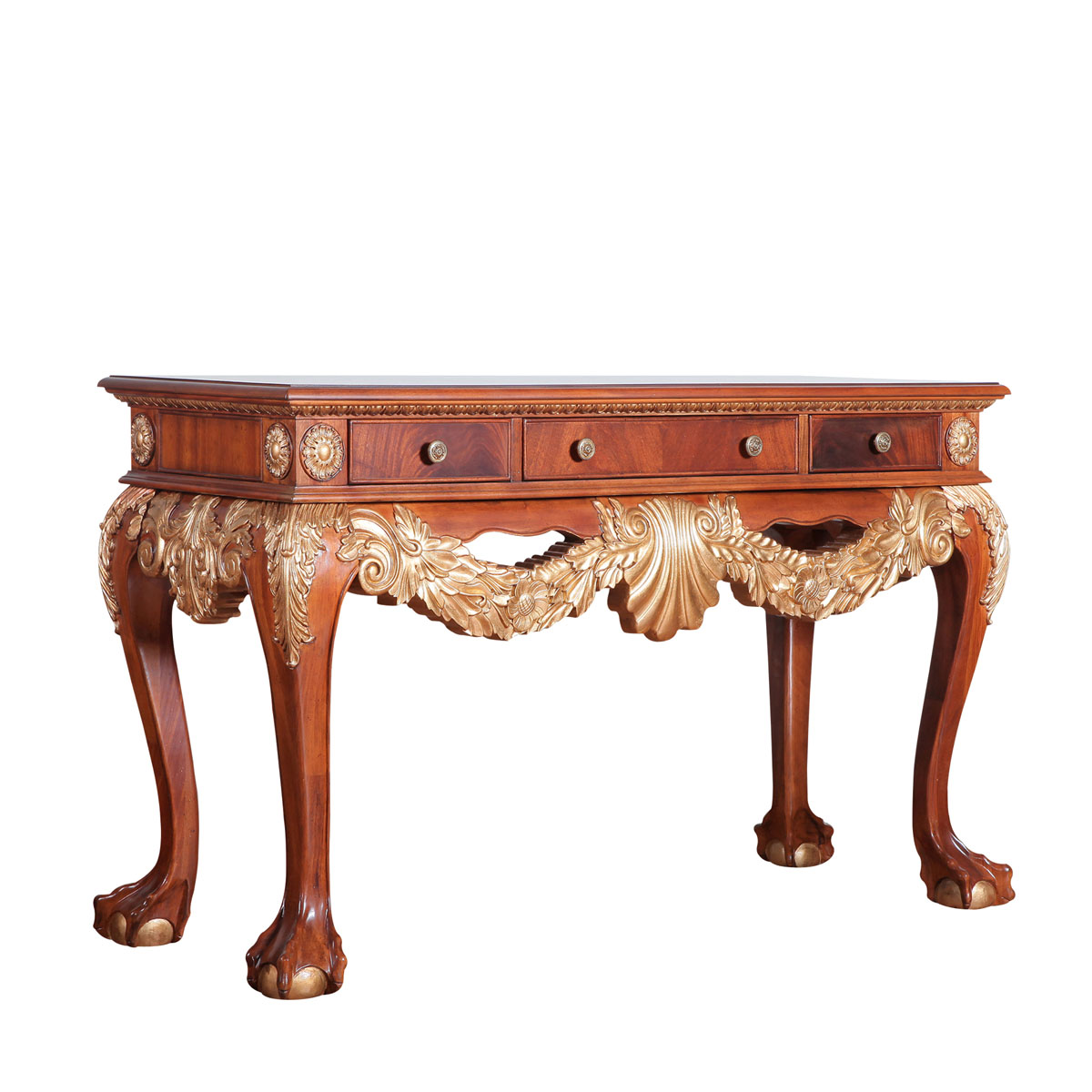 * 这是设计意念来自于英国温莎堡中乔治二世时期的沙发桌。为显示乔治二世的好战和对艺术的喜爱,设计师以狮子爪球脚设计和雕刻描金叶饰花纹,表现出英国王室的威严和典雅气质。配上细腻的木皮贴面和贴金箔工艺,是豪华系列温莎堡英式沙发桌的特色。