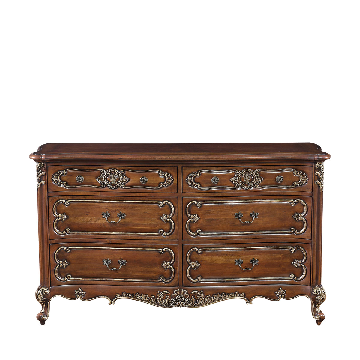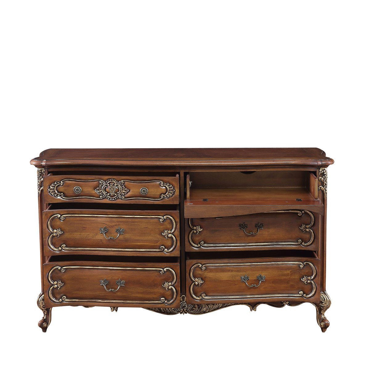 * 手工雕刻的花圃、藤蔓、阿坎瑟斯卷叶图案和弯脚设计; * 结实的连接技术; * 6个储物抽斗,右上斗为翻斗,内可置放电子器材,其底部采用经典硬木实木滑轨设计; * 脚底部装有可调脚钉;