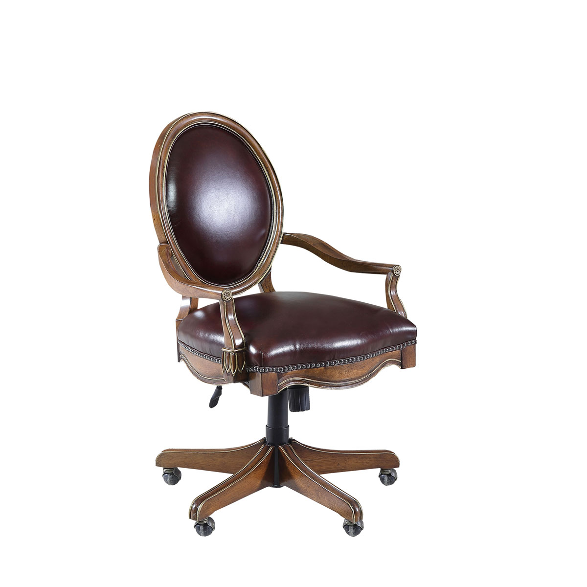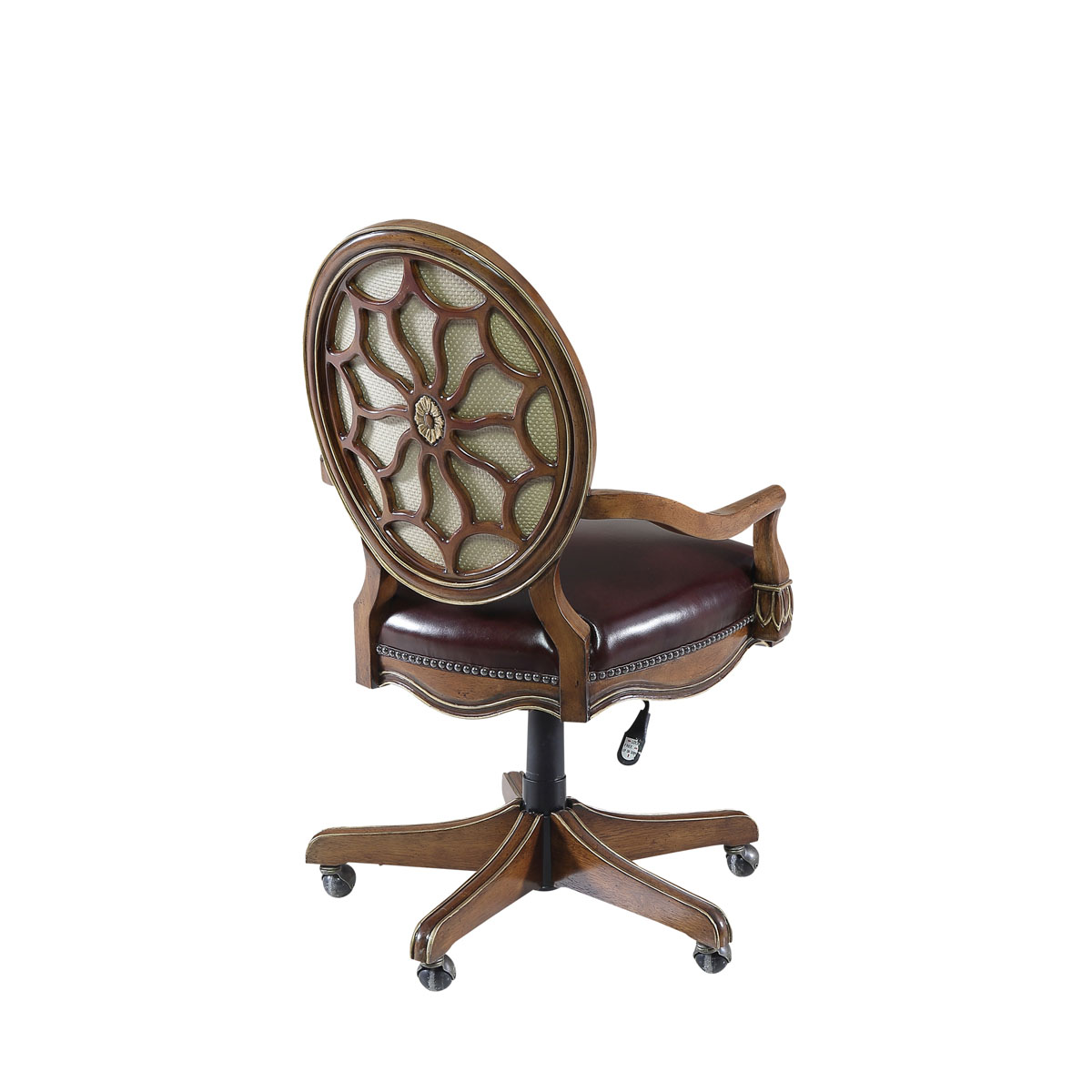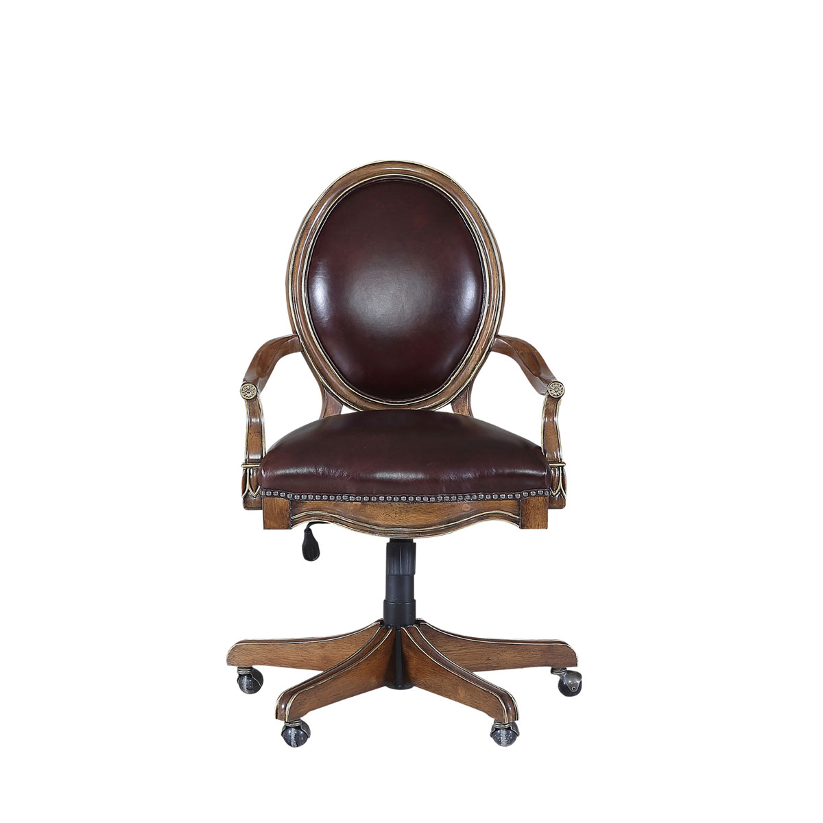 参考18世纪法国路易十六时期涂金扶手椅古董设计,并结合同时期的圆面背板设计。配上精致的仿古青铜钉、细腻的牛皮和描金工艺,可调节高度的坐垫、优美的扶手线条和360度旋转的脚轮,全方位诠释凡尔赛玫瑰的奢华。
