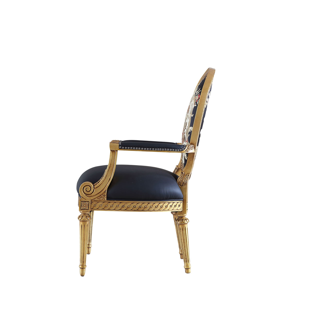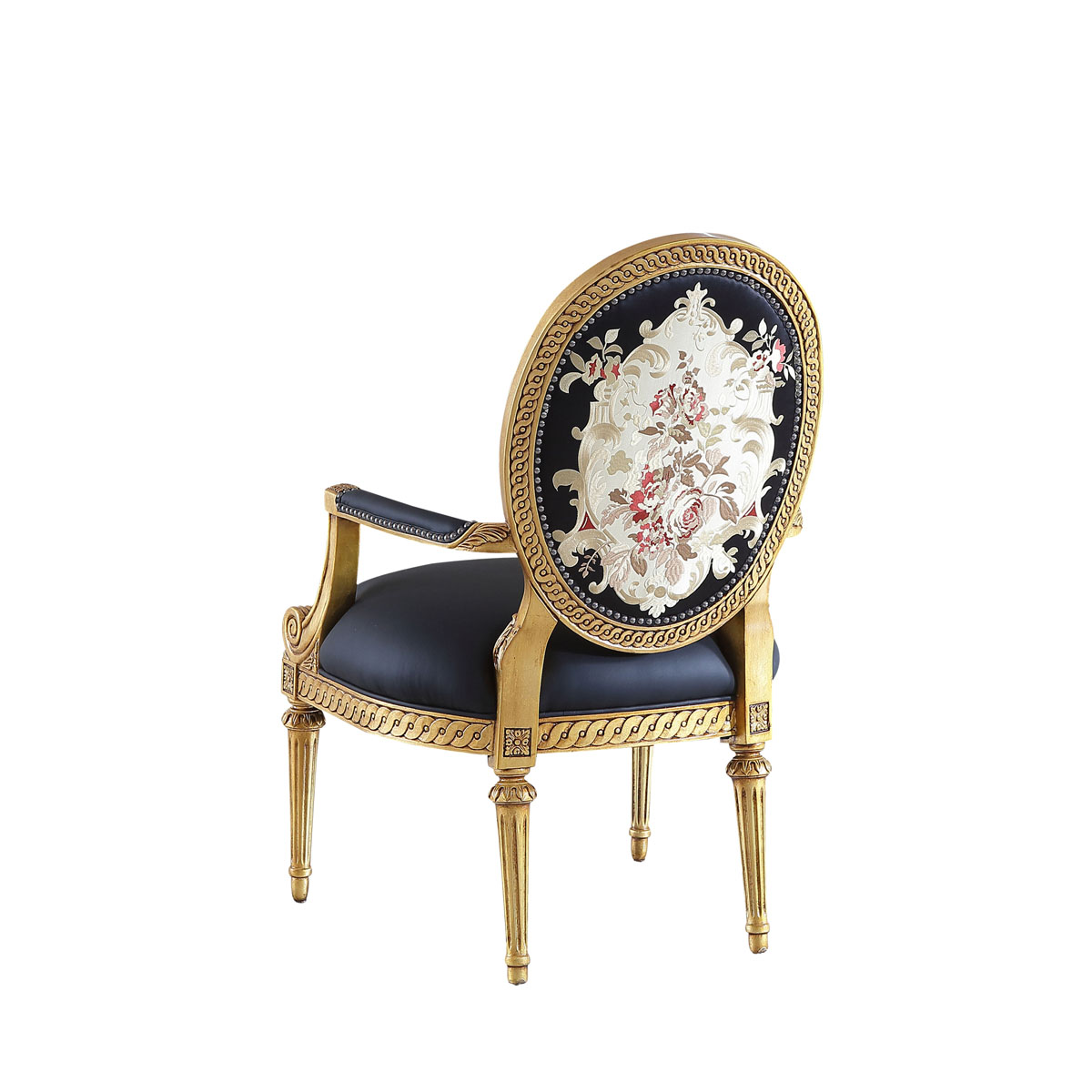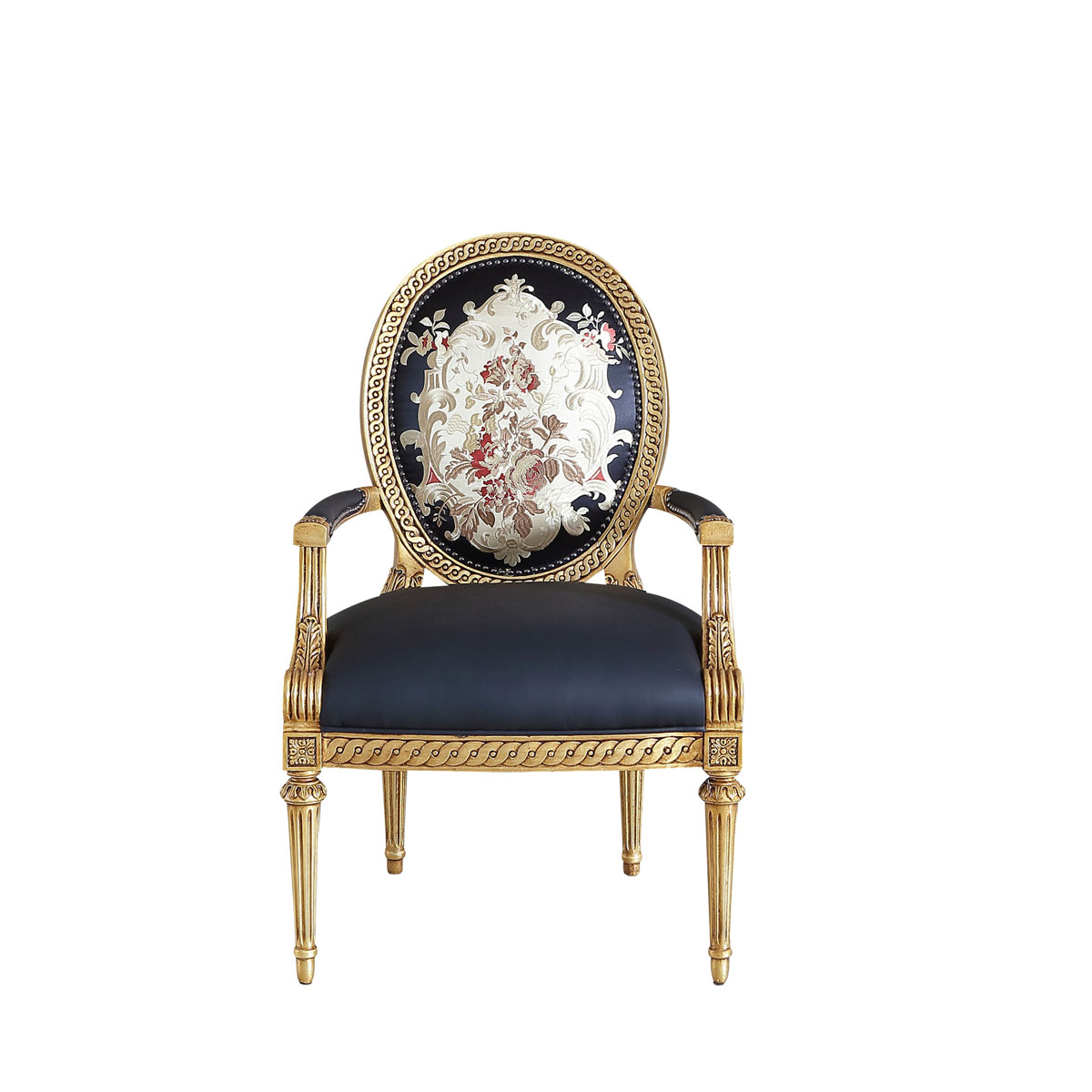 * 这款休闲椅是参考18世纪法国路易十六时期涂金扶手椅古董设计,并结合同时期的圆面背板设计。配上精致的连续雕刻和贴金铂工艺、锥形脚设计、触感舒适的布艺和包有丰厚的填充物坐垫和靠背。