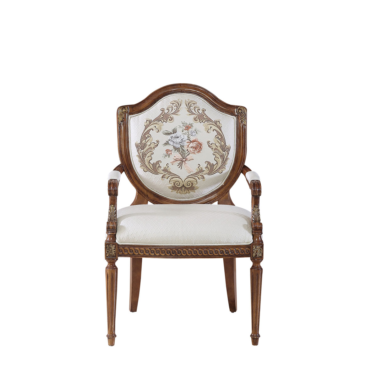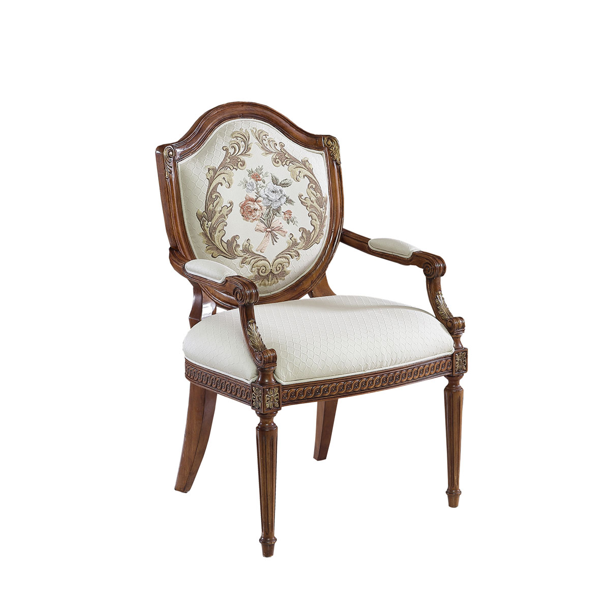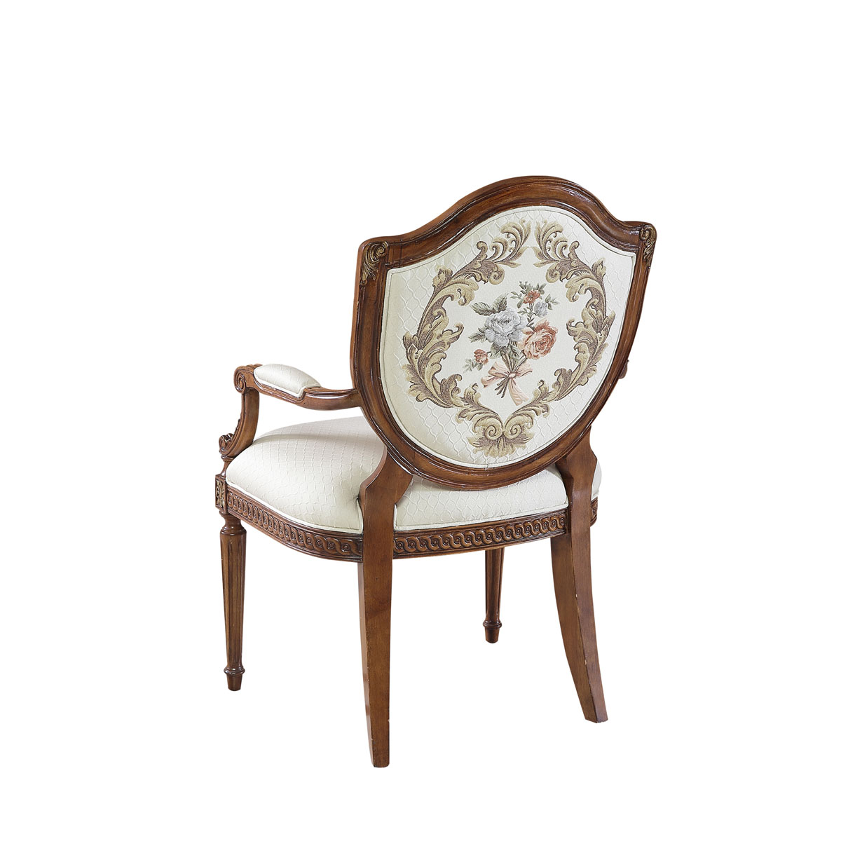法国新古典和洛可可风格,盾型椅背造型简约大方,建筑柱雕刻柱腿简约的直线条造型,端庄大气,采用印花布艺,非常有田园风的感觉。