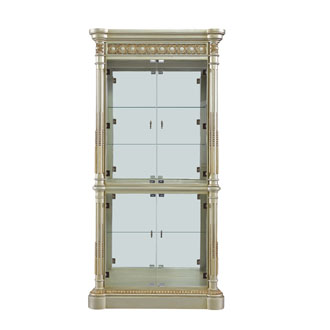 * 手工雕刻的工艺细节, 结实的连接技术; * 共三块可调玻璃层板和瓷器展示功能的沟槽,上层有装饰灯和触摸式开关;背板处装有背镜,使柜身内部的光线更通亮;