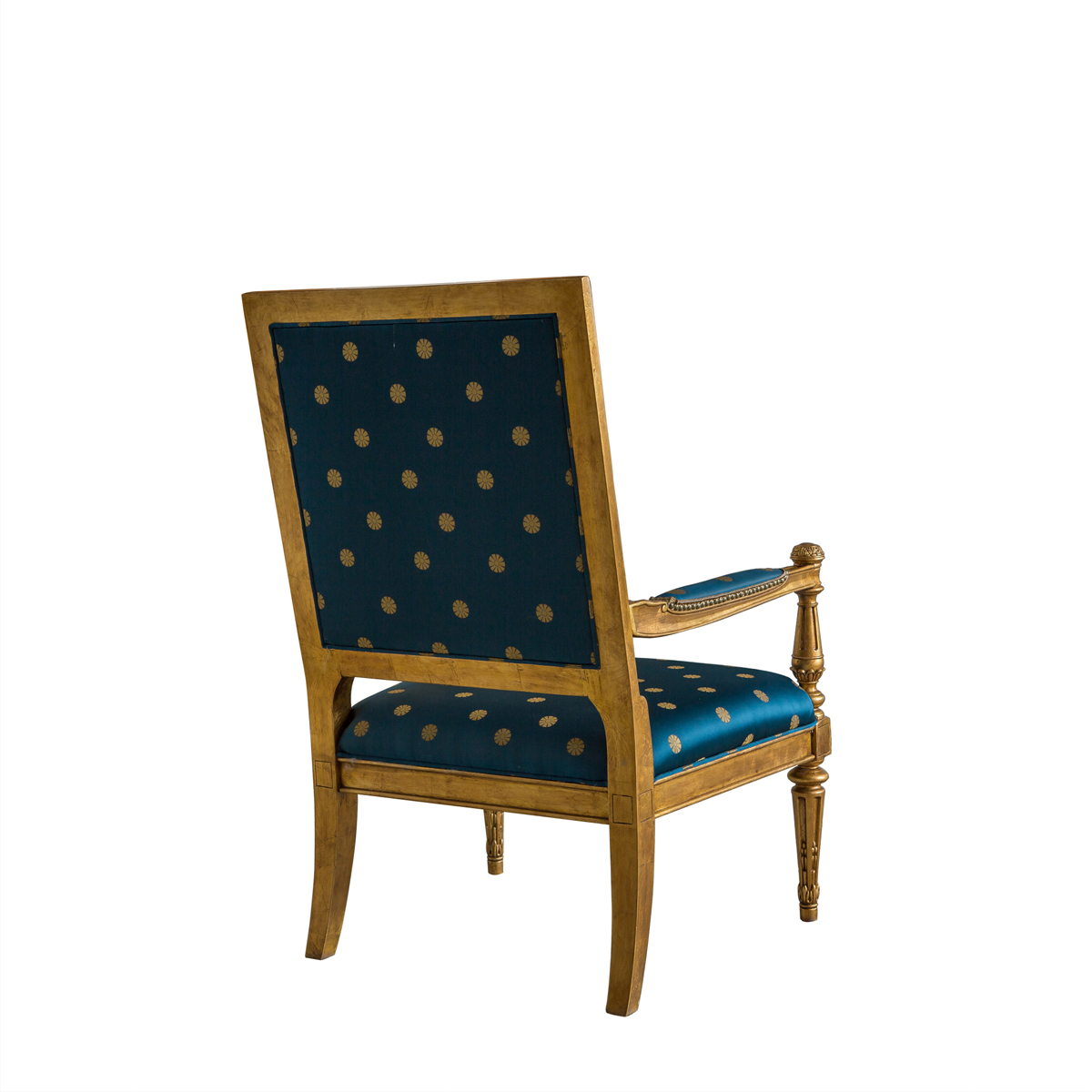 * 这是以美国白宫的Blue Room(蓝色房间) 为意念并结合法国元素而设计的沙发。包括建筑雕刻锥形脚、 权杖状的扶手柱、叶形雕刻外框和贴金铂工艺,配上代表自由的蓝色布艺和包有丰厚的填充物坐垫和靠背。