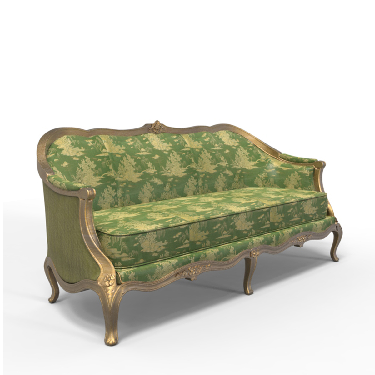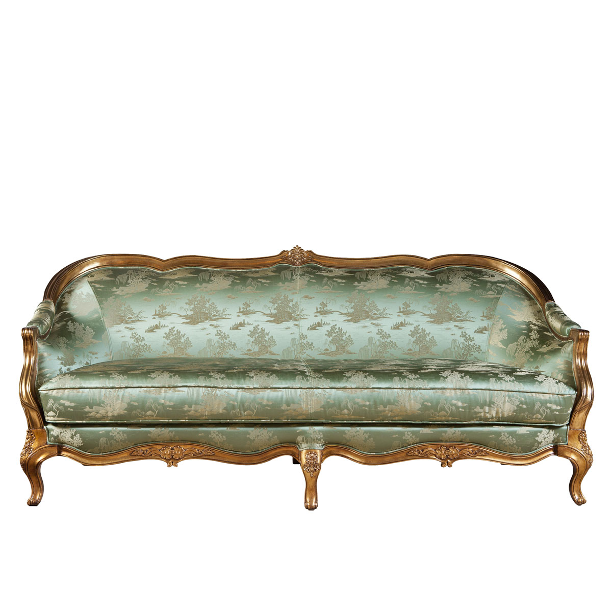* 从法国十八世纪初摄政时期的风格中汲取灵感制作而成,采用了同风格的弯脚设计,阿坎瑟斯叶雕刻造型和金箔贴饰,再饰以中国山水图案的丝绸和包有丰厚的填充物坐垫和靠背,使得这款沙发闪耀着华丽高贵的光环;