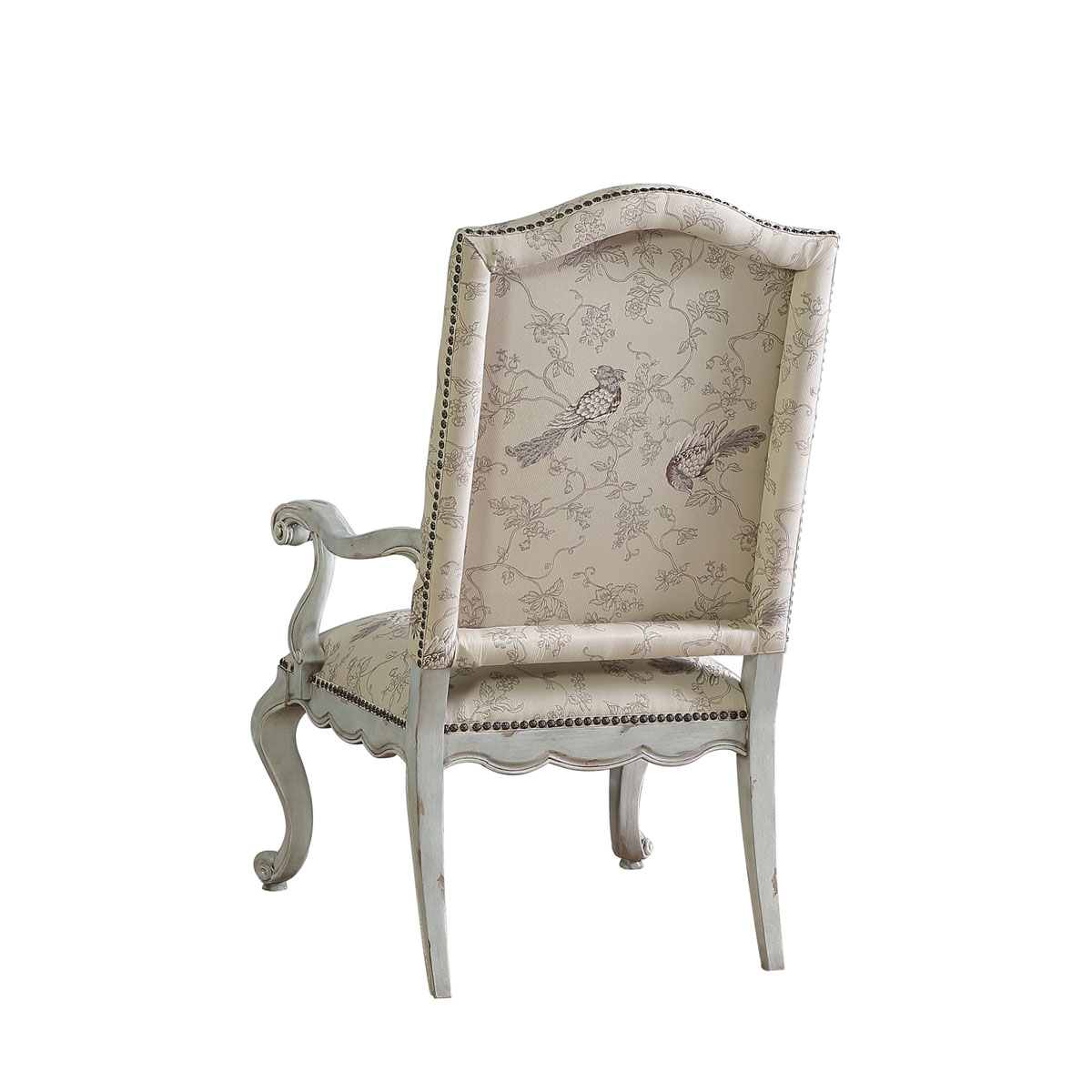 * 一款集合法式元素包括Camelback Silhouette(驼峰轮廓)造型、旋涡形扶手和S形弯脚的高背休闲椅,并配上触感舒适的布艺和包有丰厚的填充物坐垫和靠背;